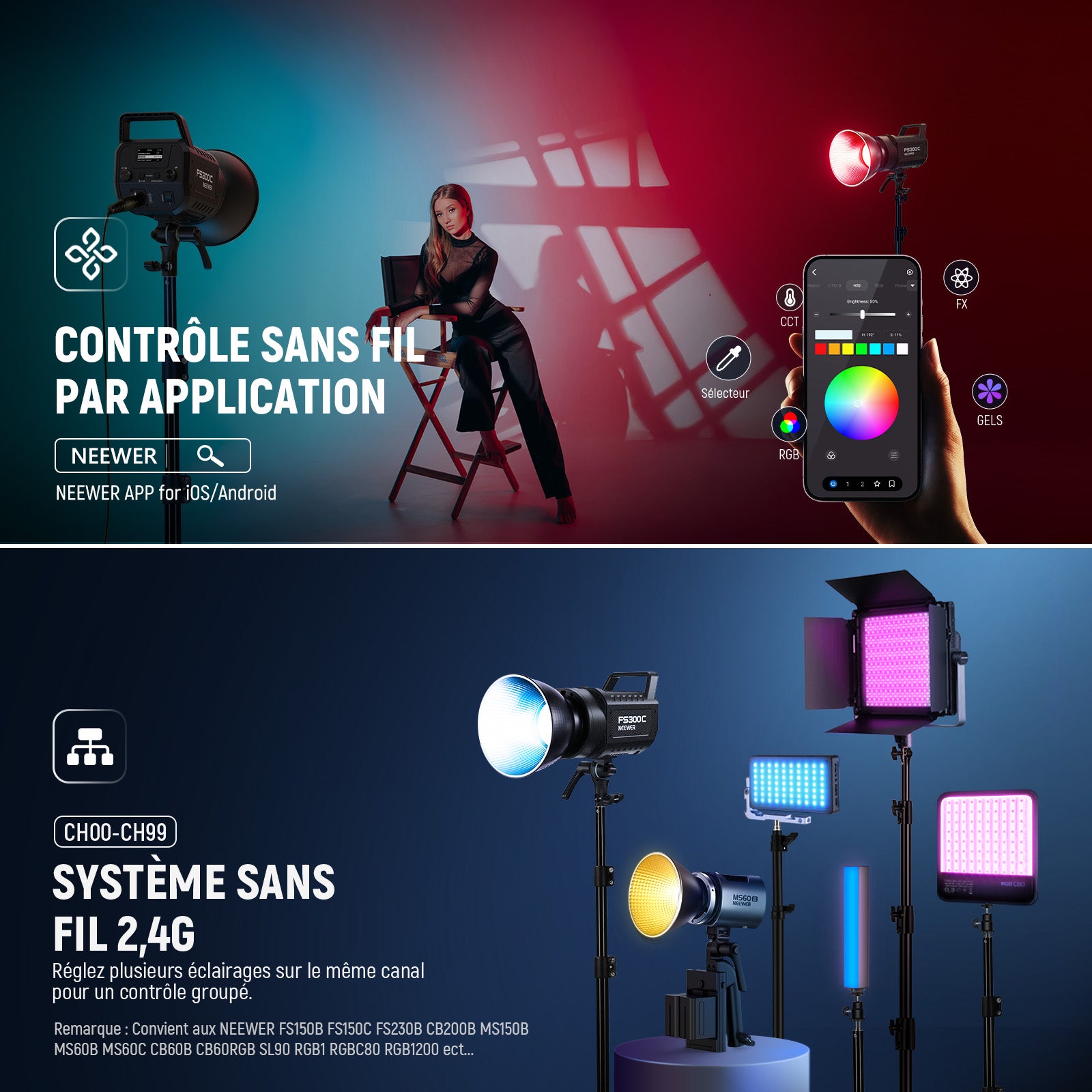 - 【Contrôle Sans Fil par APP & 2,4G】 Piloté par l'APP NEEWER pour le contrôle groupé, la mise à jour OTA du micrologiciel et les modes de contrôle tels que Light Source, Source Match & FX Music. Le système 2,4G intégré comporte les canaux 00-99, lorsque plusieurs éclairages sont sur le même canal, n'importe lequel d'entre eux peut servir d'unité maître pour contrôler les autres jusqu’à 80m. Le FS300C supporte le contrôle groupé avec NEEWER FS150B, FS230B, MS60C, MC60B, MS150B, MS150C, BH30S, CB60B