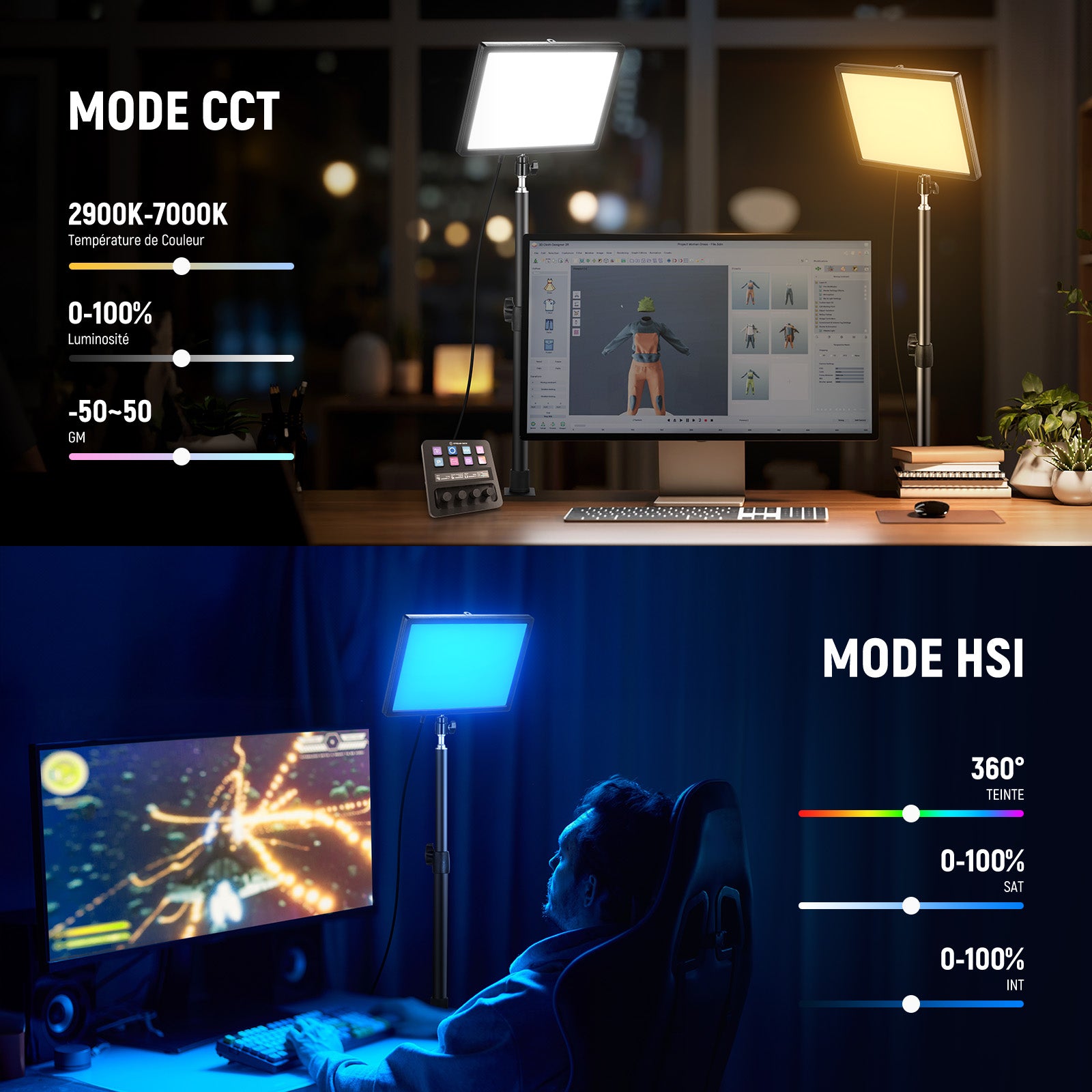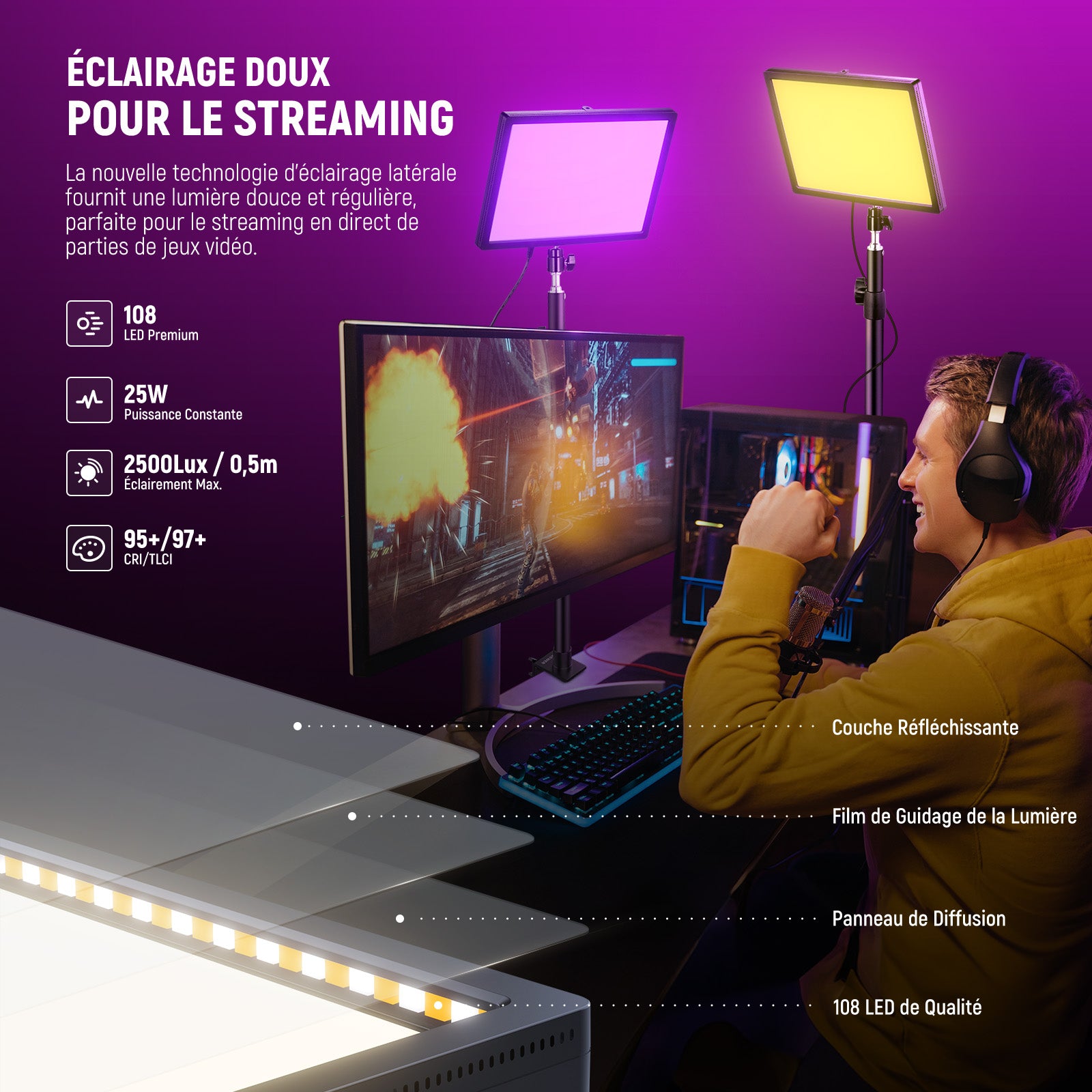 - 【Key Light Pleine Couleur Edge Lit】 GL25C avec 108 LEDs utilise la technologie Edge Lit de pointe, avec un éclairage doux et sans scintillement, 2500Lux/0,5m max ; puissance 25W, réglage de la luminosité de 0-100%. Le projecteur vidéo dispose de divers modes d'éclairage : CCT (2900K-7000K & ±50 GM value), HSI (H : 0-360°, S : 0-100%), RGBCW (R/G/B/C/W: 0-255), FX (18 effets de scène), plus des possibilités infinies pour obtenir des ambiances lumineuses diverses et créatives pour streaming live