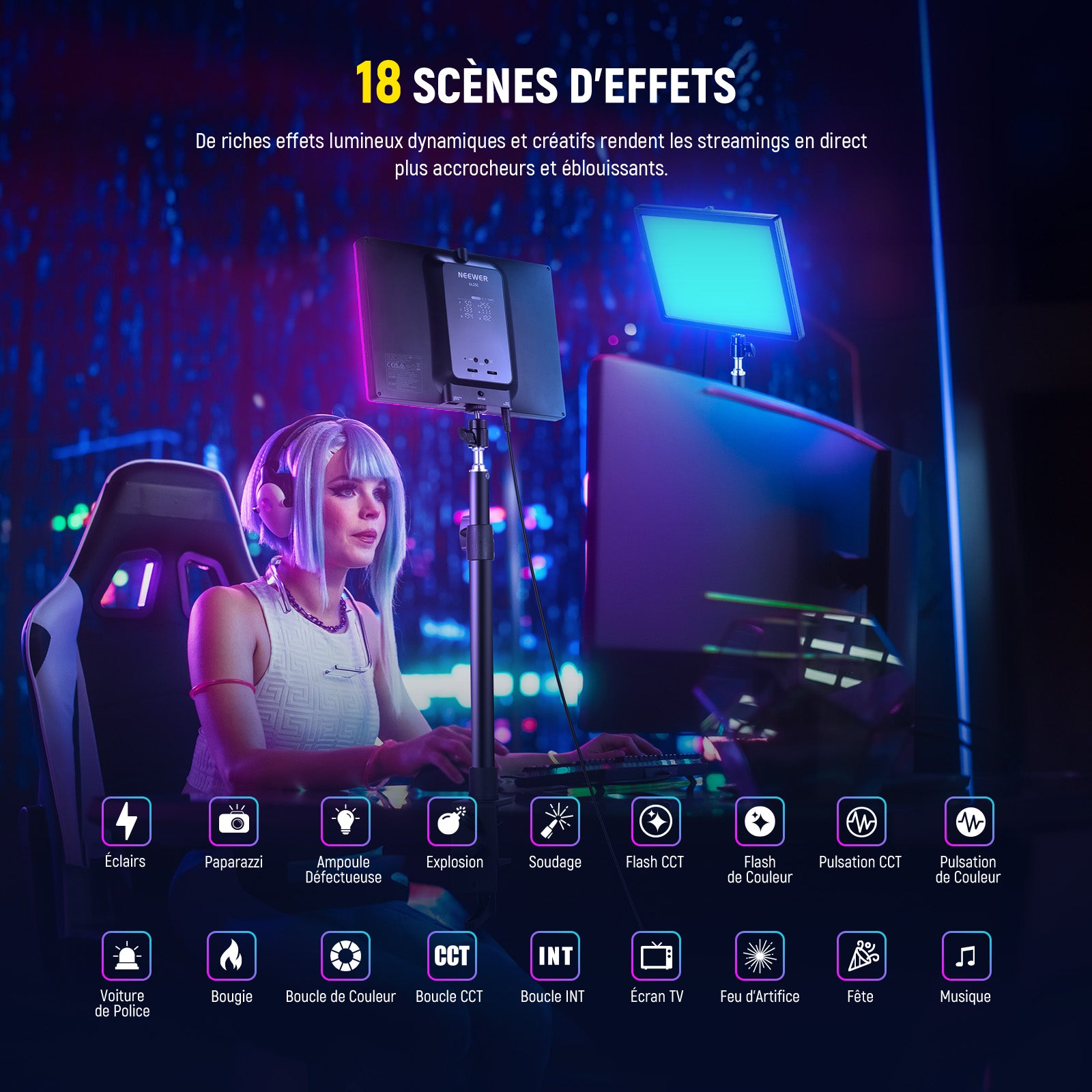 - 【Contrôle sur appareil/APP/PC】 Installez l'application 'NEEWER APP' et connectez-vous via Bluetooth pour un contrôle mobile à distance. Téléchargez 'NEEWER Control Center' sur votre ordinateur et connectez-vous via Wi-Fi pour le contrôle PC ; Téléchargez le plugin 'NEEWER Live' depuis Elgato et connectez-le à 'NEEWER Control Center' pour ajuster la luminosité, la température de couleur, les effets d’éclairage, etc. Des boutons physiques sont intégrés pour une manipulation plus simple.