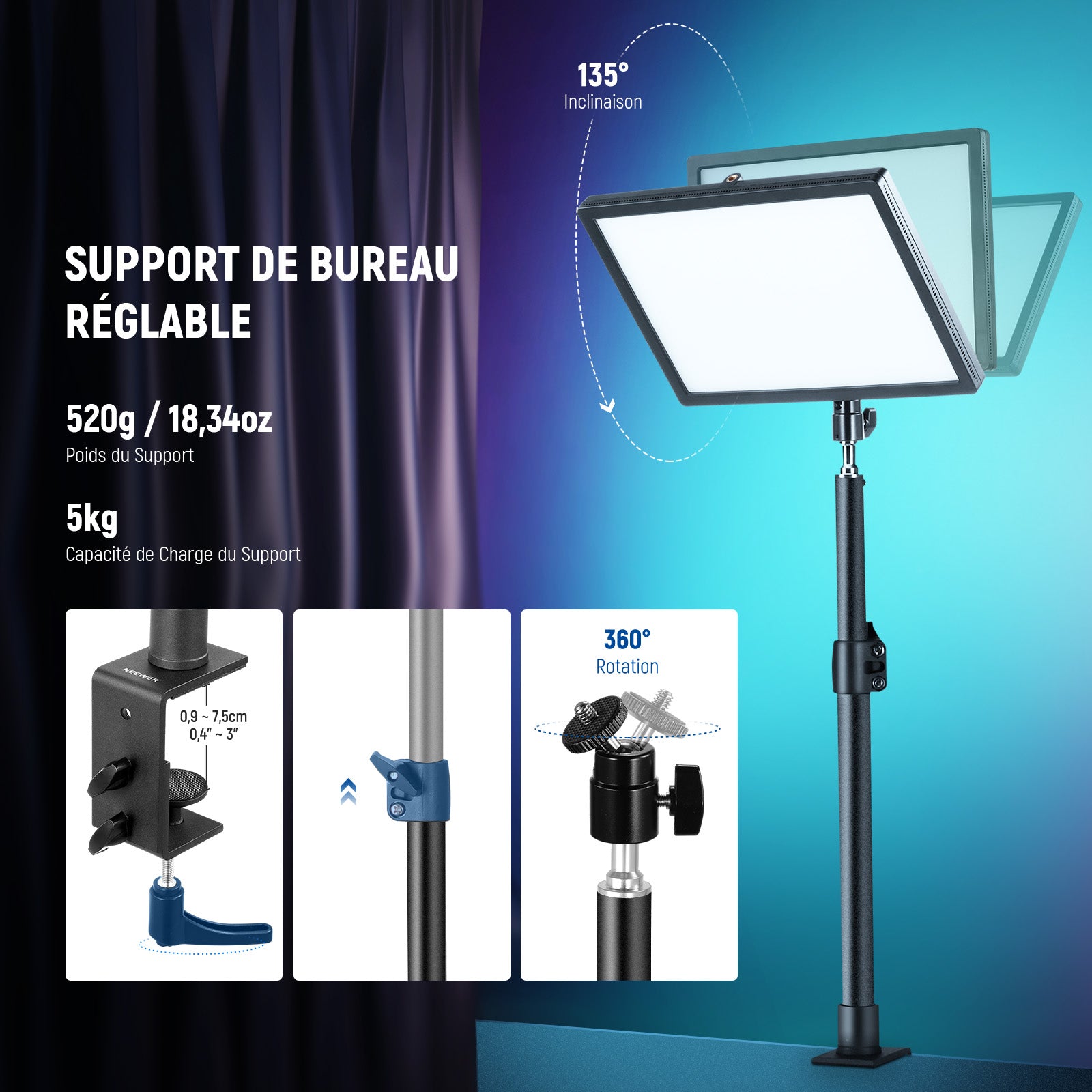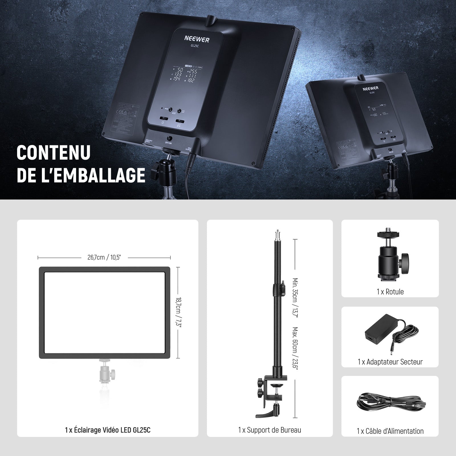 - 【Contenu du paquet】 Ce kit contient 1xlumière vidéo LED GL25C, 1xsupport de bureau, 1xadaptateur d'alimentation, 1xcordon d'alimentation et 1xtête boule. Pour streaming de jeux sur ordinateurs, appels Zoom, vidéoconférences, réunions, conférences, tutoriels de maquilleurs, selfies, enregistrements vidéo, et création de réseaux YouTube/TikTok. La lampe peut être montée sur divers supports de bureau NEEWER pour obtenir les angles d'éclairage souhaités, tels que NK003, ST200, ST-DT3560 et TL283