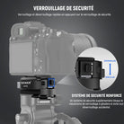 - 【Système de Verrouillage Simple & Sûr】 Fixez la plaque à dégagement rapide sur la base à pince pour la verrouiller automatiquement, puis actionnez le bouton de verrouillage de sécurité pour plus de sûreté. Lorsque vous retirez la plaque QR, déverrouillez le loquet, il se reverrouillera pour éviter de vous pincer les doigts lors de l'installation suivante