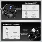 - 【Compatibilité Universelle 1/4"】 Montez facilement des équipements comme des caméscopes, des appareils photo, des téléobjectifs, des sliders, des téléphones, des adaptateurs pour action cam et d'autres équipements ou accessoires photo et vidéo sur un stabilisateur ou une tête de trépied grâce à la vis de montage 1/4" universelle. Les patins antidérapants en caoutchouc de la plaque QR protègent contre les rayures. La clé hexagonale en L fournie permet une utilisation dès la sortie de la boîte