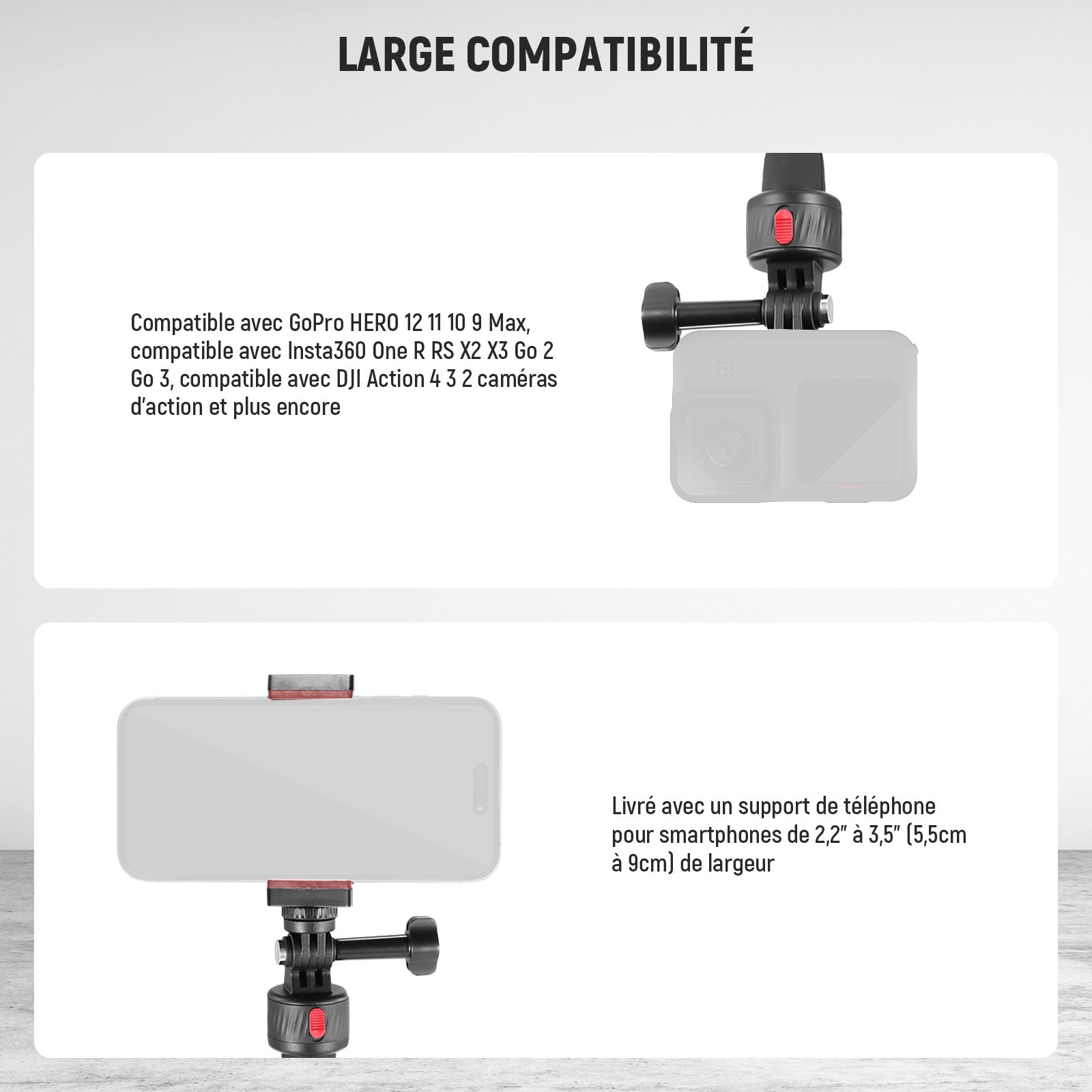 - 【Large compatibilité】 conçu avec adaptateur montage à dégagement rapide, NEEWER GP-17 support telephone cou est compatible avec GoPro Hero 13 12 go pro hero 11 10 Black Max, compatible avec Insta360 One RS X3 x4 Go 3 insta 360 ace pro, compatible avec DJI Action 4 3 2. Livré avec support pince téléphone pour smartphone de 5,5cm à 9cm de largeur et adaptateur 1/4" inclus pour iPhone 16 15 14 13 Pro Max Samsung Galaxy S24 S23 S22 Ultra Huawei Pixel 8 7 Pro et autres smartphones