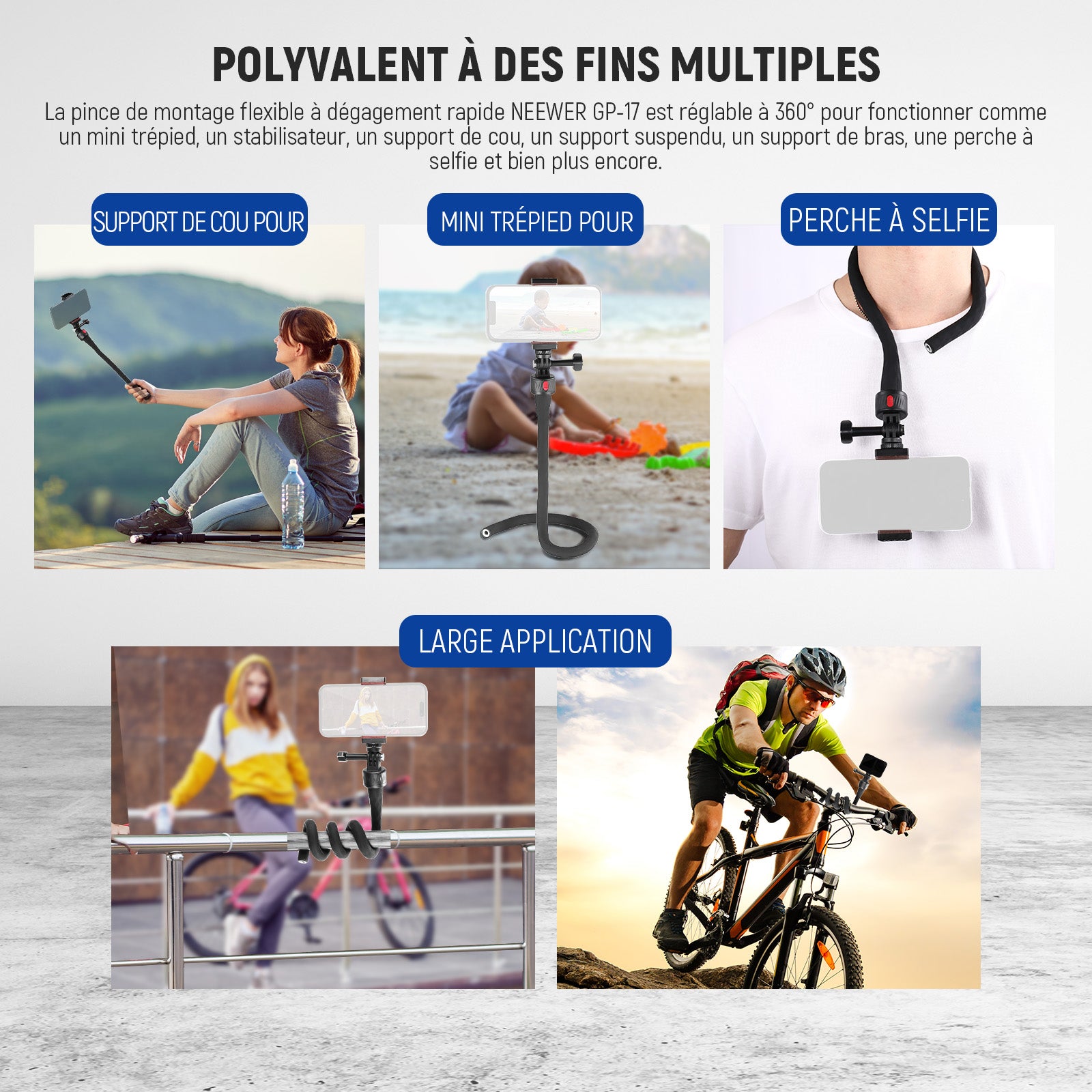 - 【Polyvalent pour de multiples usages】 NEEWER GP-17 est un support de caméra flexible qui ouvre des possibilités de prise de vue illimitées, facile à utiliser en pliant et en tournant la tige en silicone pour l'enrouler autour de n'importe quelle surface telle qu'un guidon de vélo ou de moto, un appui-tête de voiture, un caddie, une poussette, vélo de spinning,tapis roulant, arbre, poteaux, rails et d'innombrables autres articles. Libérez vos mains et obtenez des angles de prise de vue inattendus