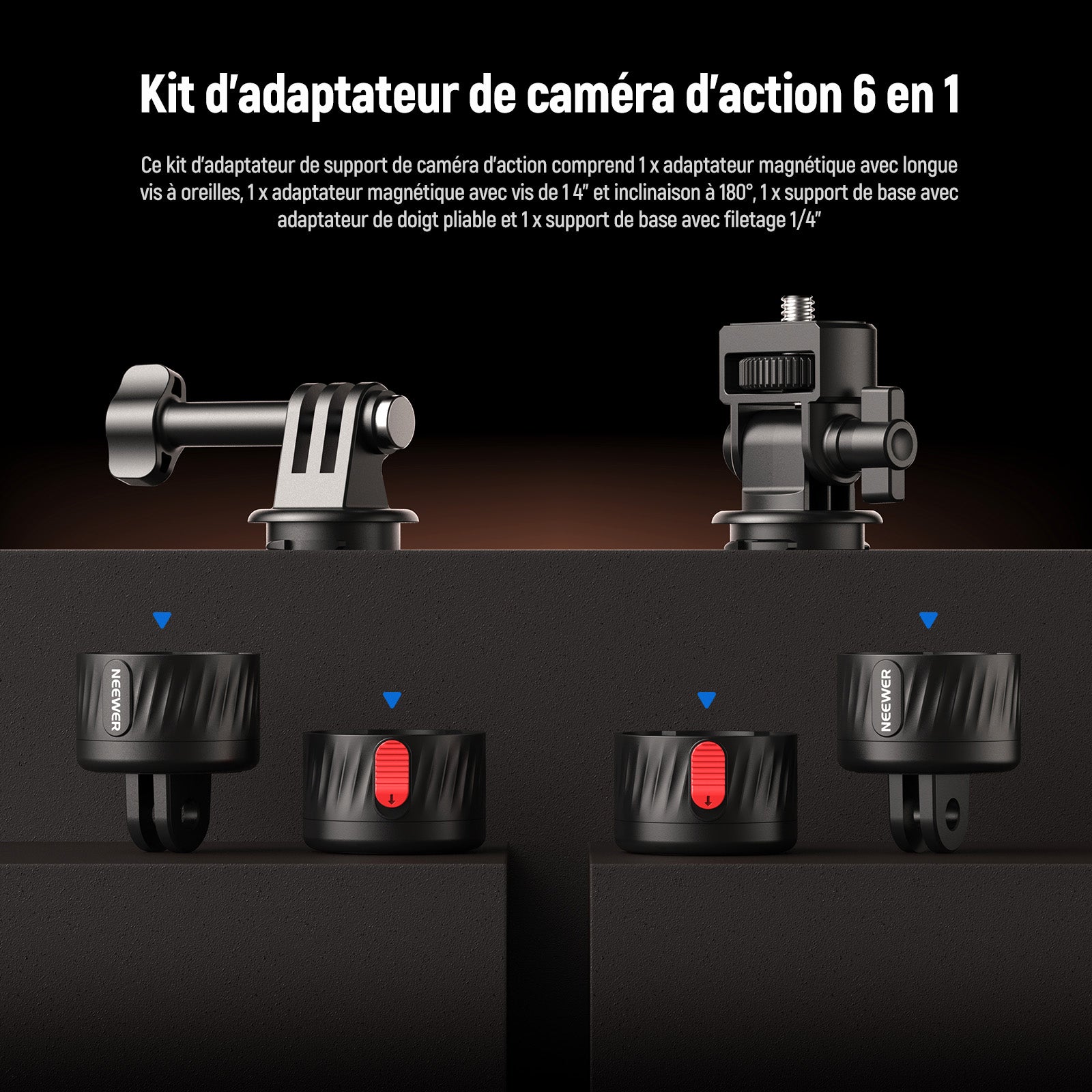 - Kit d'adaptateur pour caméra d'action : ce kit d'adaptateur de support de caméra d'action comprend 1 adaptateur magnétique avec longue vis moletée, 1 adaptateur magnétique avec vis de 6,35 mm et inclinaison à 180°, 2 supports de base avec 2 broches, 2 supports de base avec filetage 6,35 mm