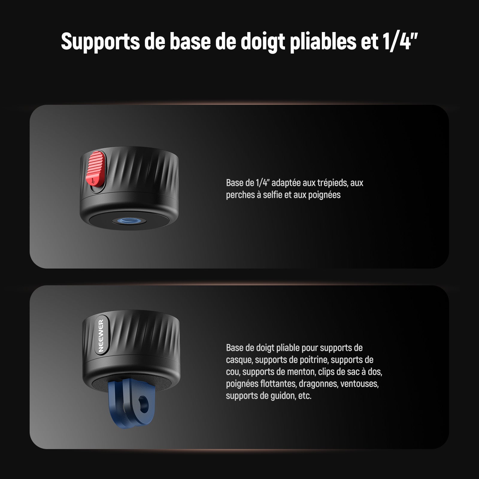 - Supports de base pliables de 6,35 mm et pliables : le support de base de 6,35 mm est conçu pour les trépieds, les perches à selfie et les poignées. Le support de base pliable peut être fixé aux supports de casque mains libres, aux supports de harnais de poitrine, aux supports de cou, aux supports de tête, aux supports de mentonnière, aux clips de sac à dos/chapeau, aux poignées flottantes, aux sangles de poignet, aux supports à ventouse, aux supports de guidon de poussette/moto/vélo