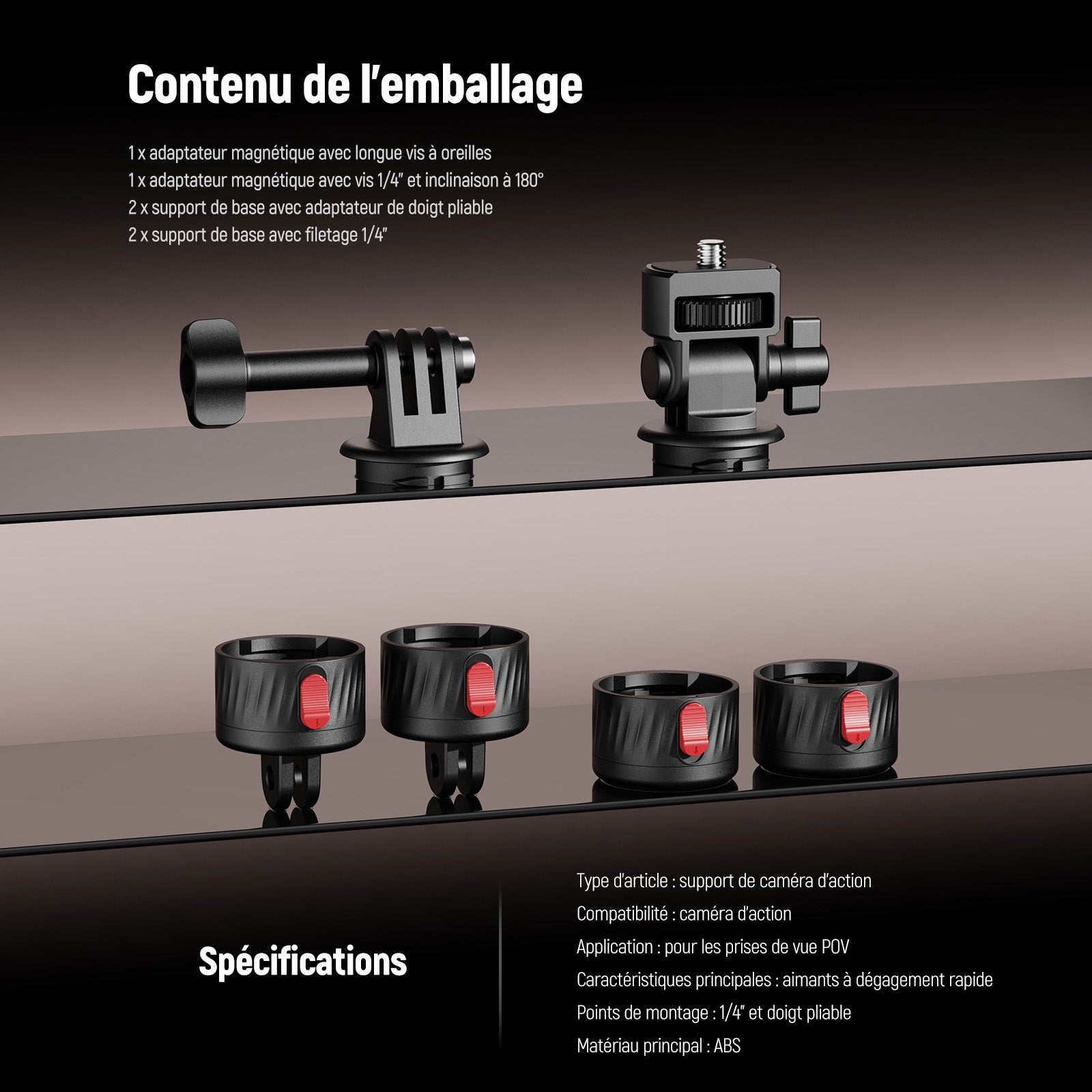 - 1 x Adaptateur magnétique avec vis 1/4" et inclinaison de 180°