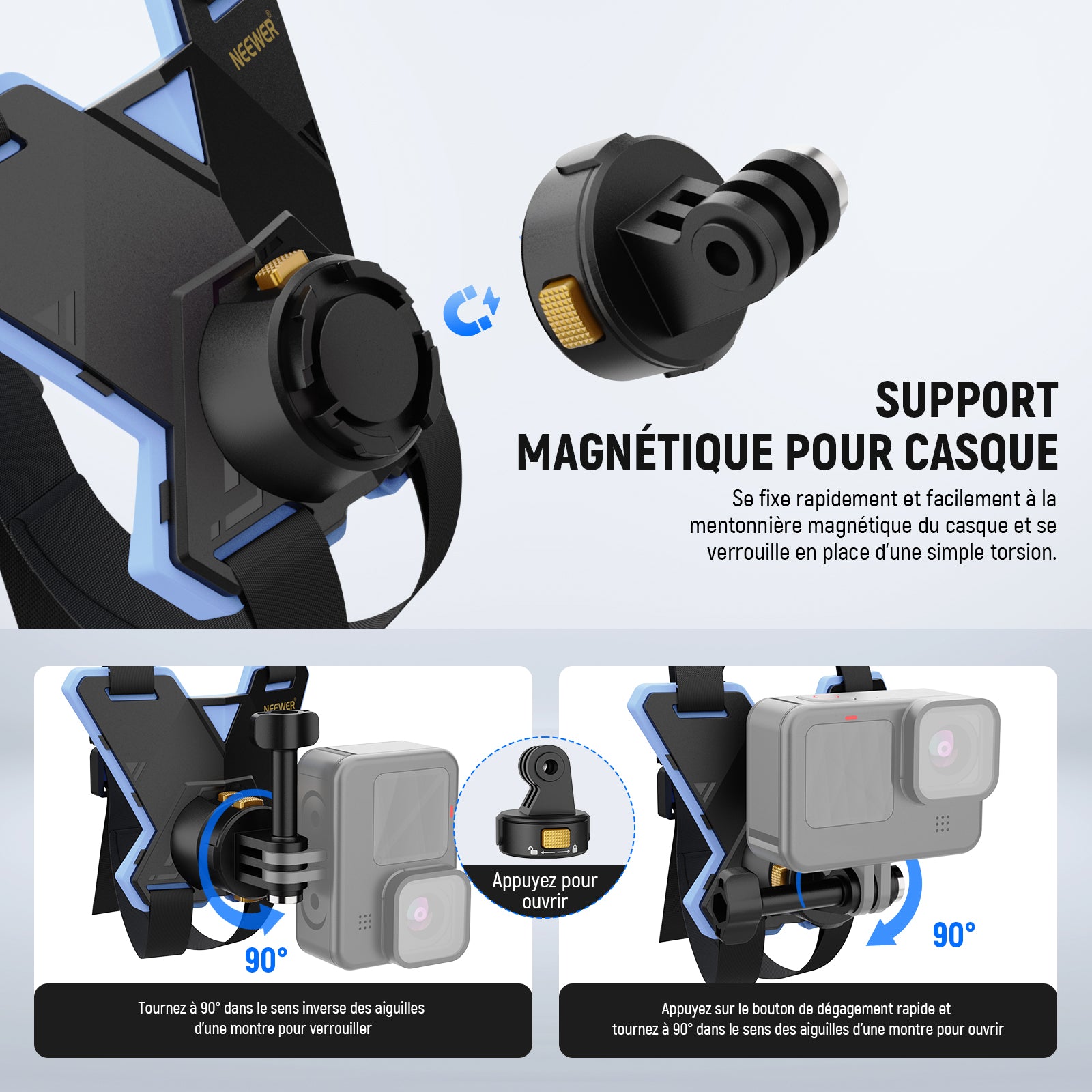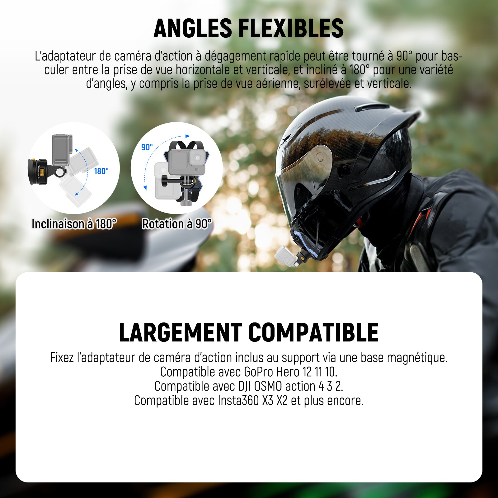 - 【Pour caméras d'action】 Le kit d'accessoires de fixation mentonnière pour casque de moto GP19 est compatible avec les GoPro Hero13, Hero12, GoPro 11, 10, 9, 8, 7 Black, Max, compatible avec DJI Osmo Action 5, Pro 4, 3, 2, compatible avec Insta360 Go 3, 2, Go 3S, X4, X3, ONE R, Insta360 Ace Pro, et compatible avec les combos AKASO Brave 8, 7, 4, etc., grâce à l'utilisation de l'adaptateur de montage magnétique à dégagement rapide et d'un adaptateur supplémentaire avec une vis de 1/4". Également compatible avec le système à dégagement rapide NEEWER (2e génération).