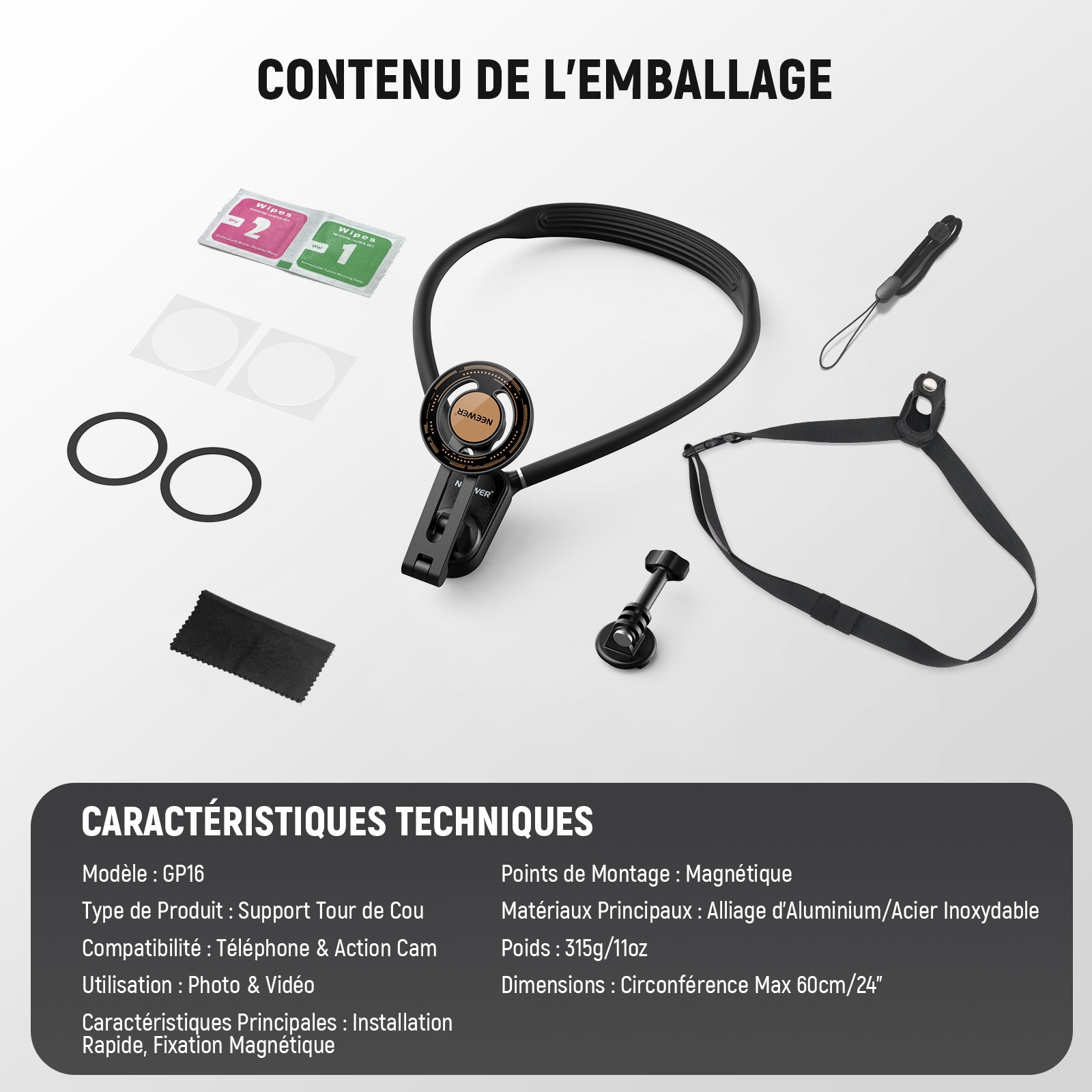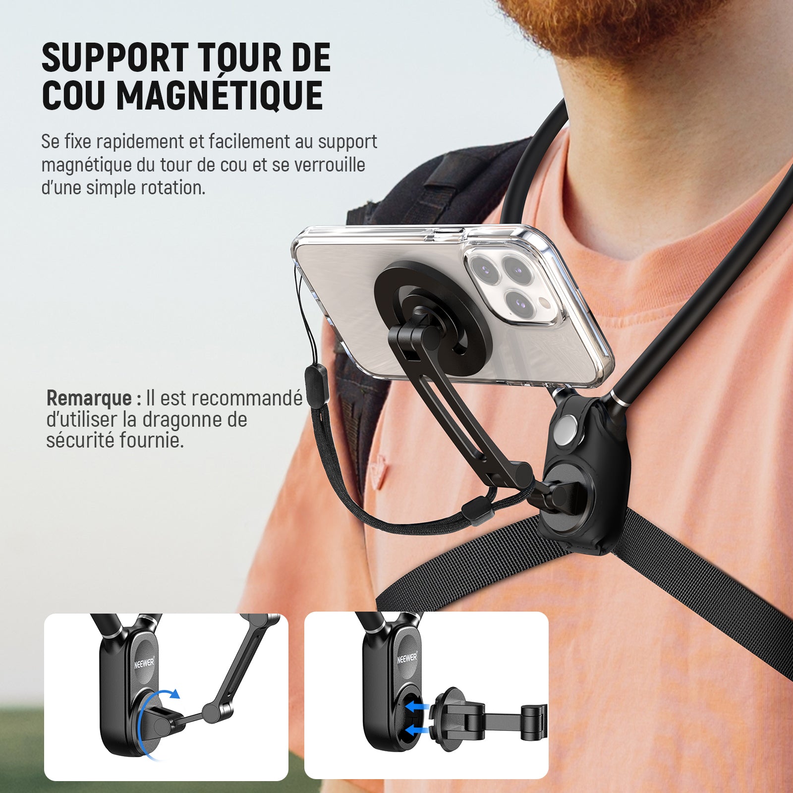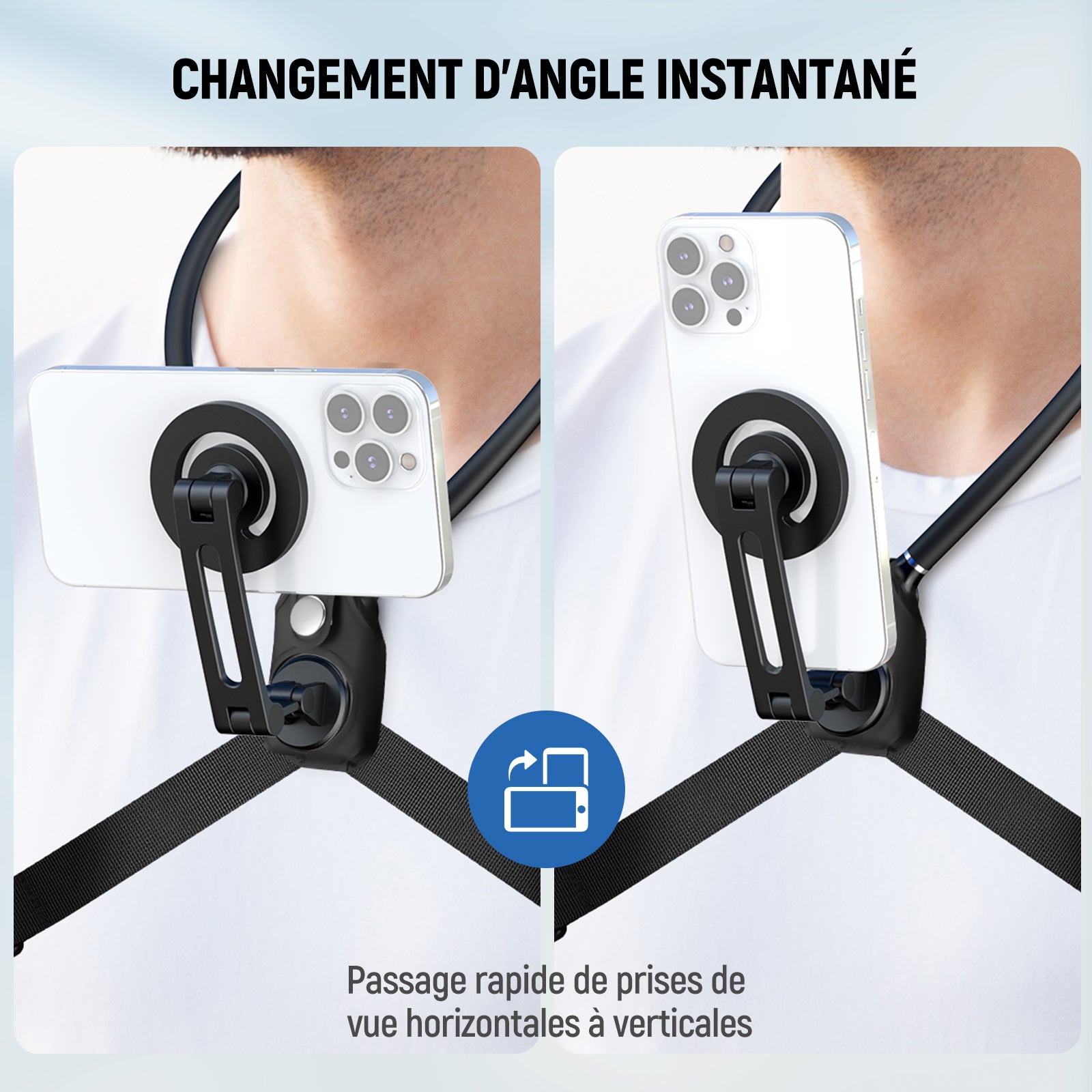 - Filmez à mains libres- Le tour de cou magnétique comporte un support de téléphone flexible compatible avec MagSafe cage pour iPhone 16 15 14 13 Pro Max Samsung Galaxy S24 S23 S22 Ultra Huawei Pixel 8 7 Pro, etc. Pour les téléphones ne possédant pas de système magnétique, les 2 anneaux magnétiques inclus peuvent être fixés à une coque de téléphone afin d'améliorer la compatibilité, le GP26 est adapté à presque tous les smartphones.