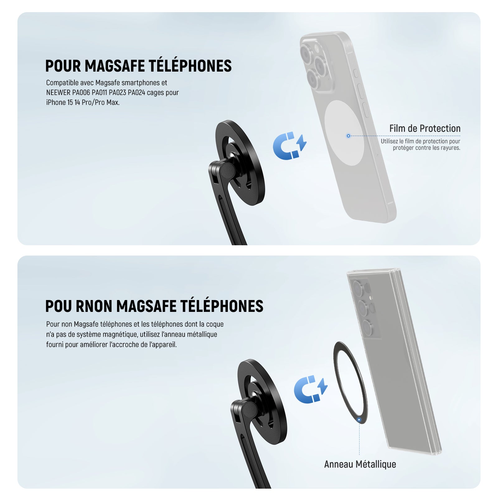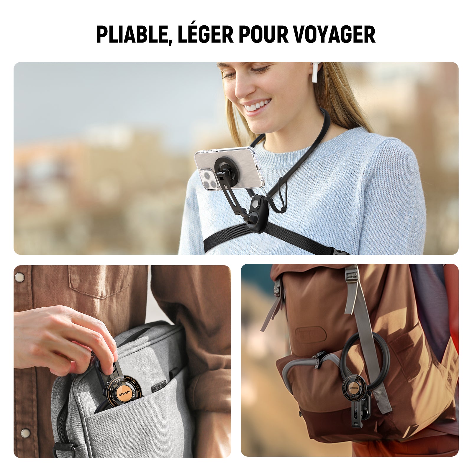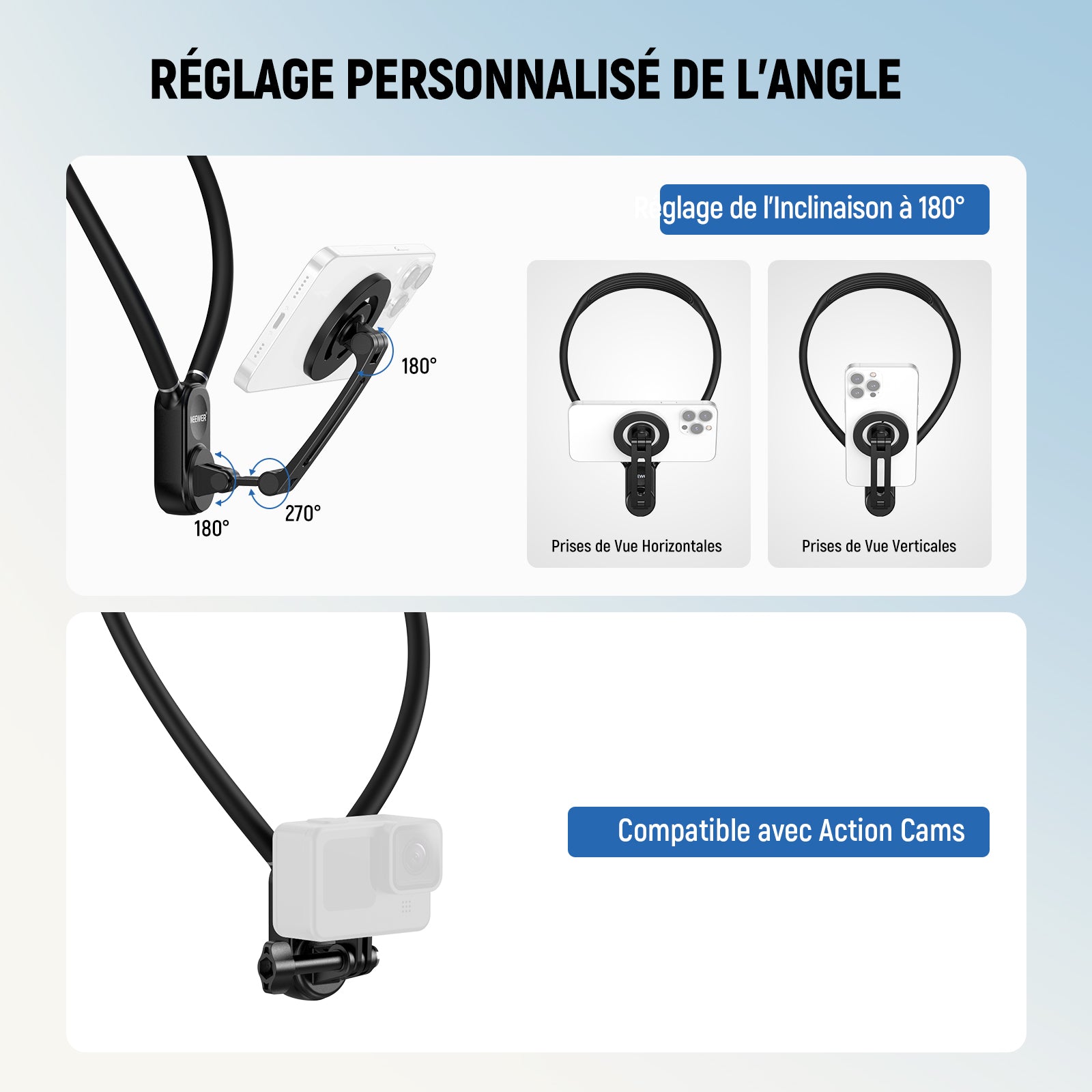 - Filmez à mains libres- Le tour de cou magnétique comporte un support de téléphone flexible compatible avec MagSafe cage pour iPhone 16 15 14 13 Pro Max Samsung Galaxy S24 S23 S22 Ultra Huawei Pixel 8 7 Pro, etc. Pour les téléphones ne possédant pas de système magnétique, les 2 anneaux magnétiques inclus peuvent être fixés à une coque de téléphone afin d'améliorer la compatibilité, le GP26 est adapté à presque tous les smartphones.