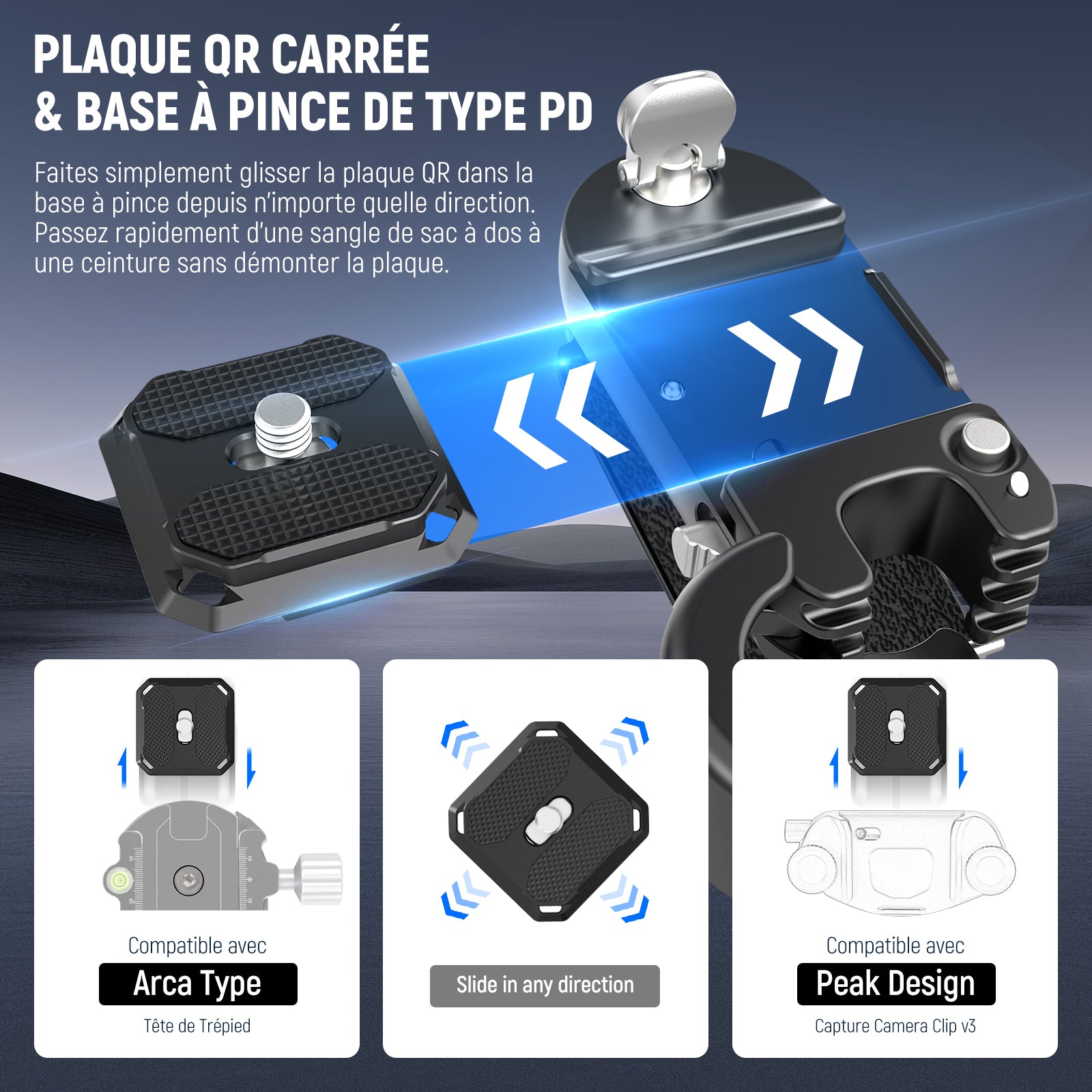 - 【Plaque QR Carrée & Base à Pince de Type PD】 La pince de montage QR est seulement compatible avec Peak Design plaques QR Capture Clip et la plaque de type Arca fournie. Il suffit de glisser la plaque QR dans la base à pince dans n'importe quelle direction, passez rapidement d'une sangle de sac à dos à une ceinture sans démonter la plaque