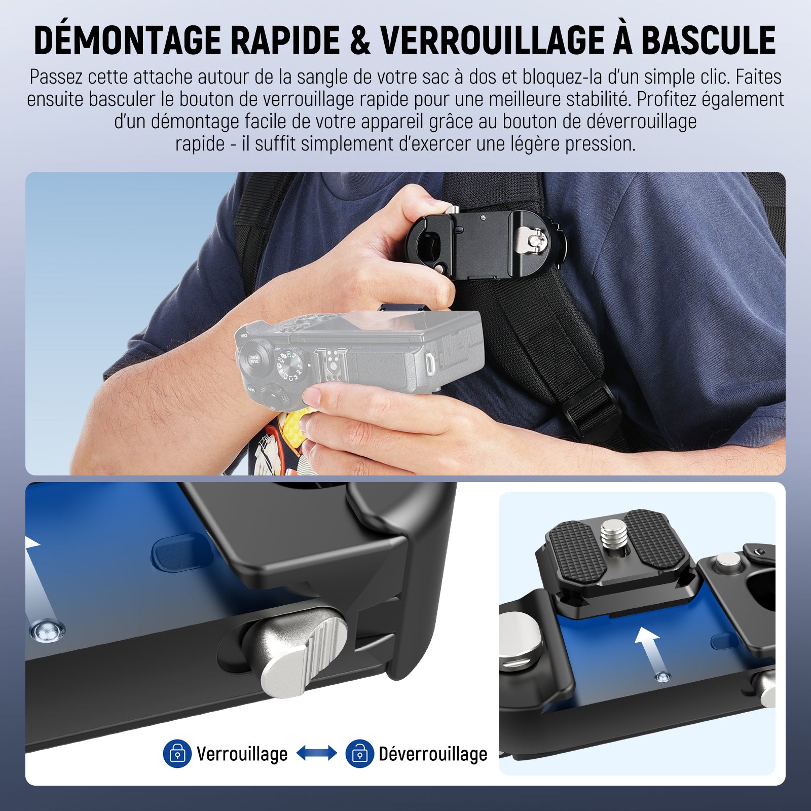 - 【Montage Sûr & Démontage Rapide】 Le clip de fixation se fixe facilement à la sangle du sac à dos d'un simple clic et est équipé d'un nouveau loquet de sécurité pour éviter tout décrochage accidentel. De plus, vous pouvez retirer votre appareil facilement grâce au bouton de déverrouillage rapide - une légère pression suffit