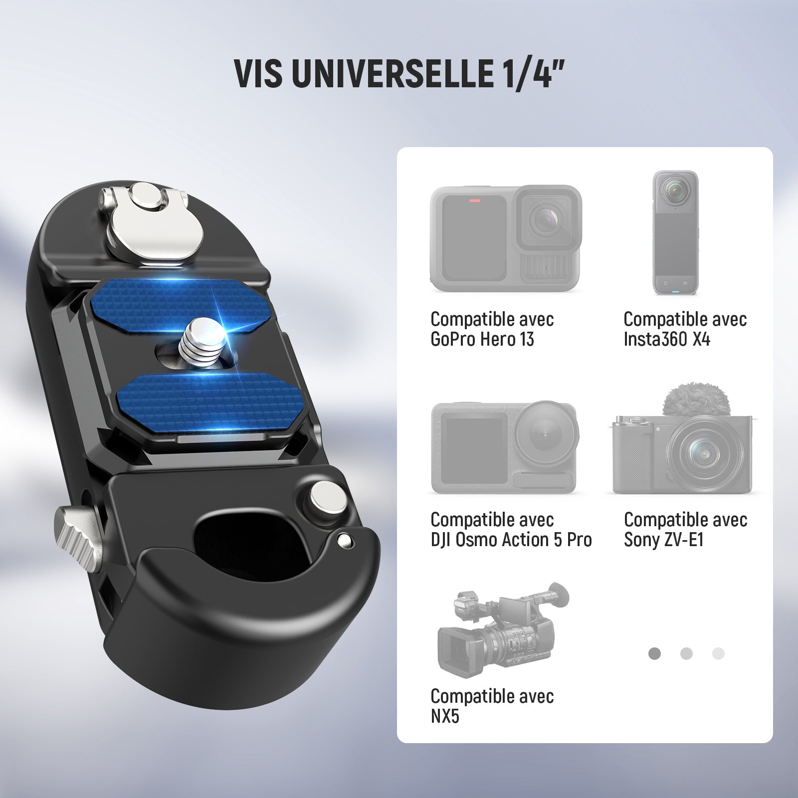 - Compatibilité : Appareils photo reflex (DSLR), caméras d’action