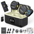 - 24H Battery Life & Easy Charging- The compact charging case features an HD display showing the battery level of the transmitters. Each transmitter can work up to 8H, with the charging case, providing a battery life of 24 hours. You can also use the charging cable to power the transmitter directly. You can also charge your phone through the port of the RX, perfect for extended audio recording without any interruption