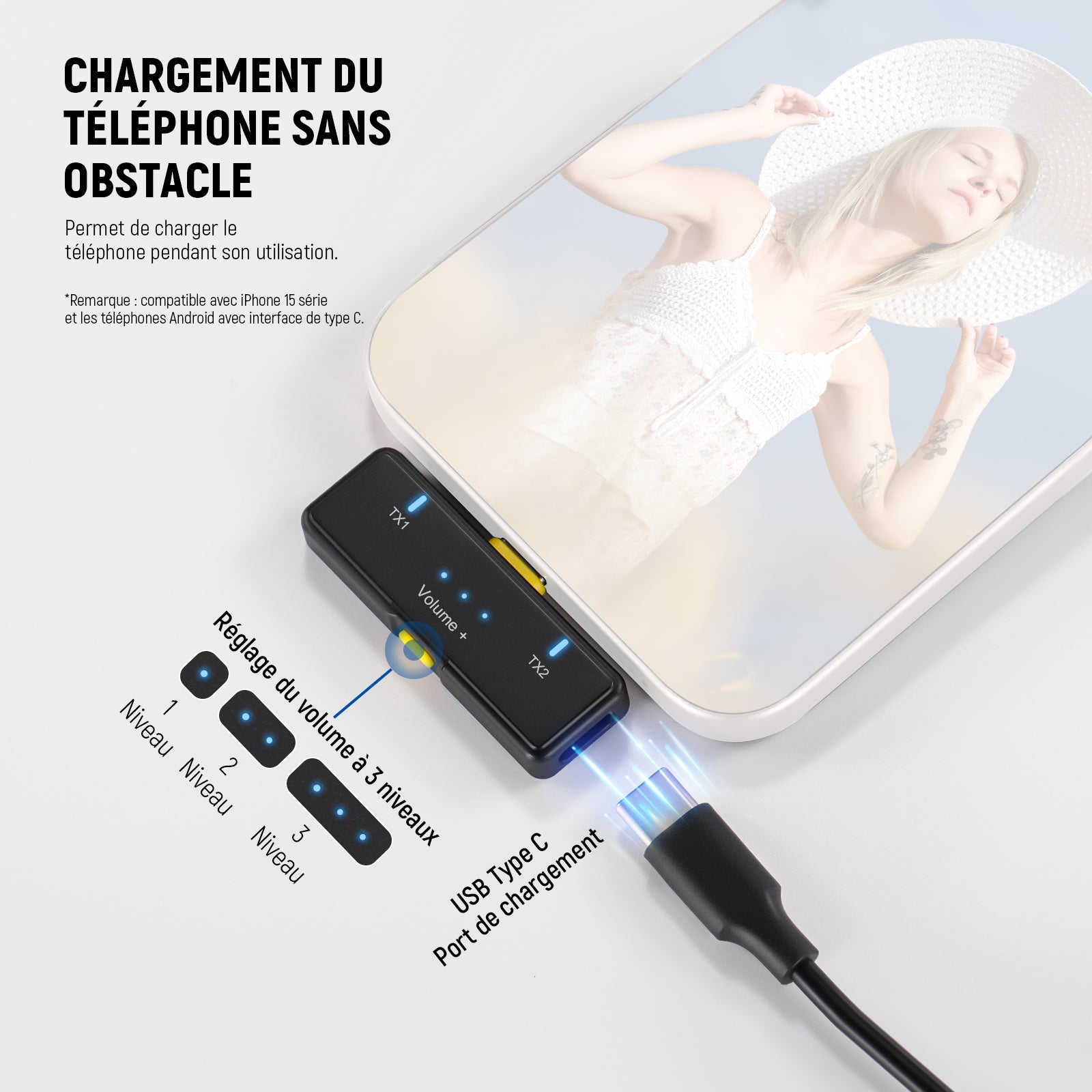 - 【Pratique et portable】 Le microphone cravate sans fil est prêt à l'emploi. Branchez simplement le RX sur votre téléphone portable ou d'autres appareils dotés d'une interface USB de type C. Chaque micro ne pèse que 8g, ce qui n'affecte pas l'apparence du collier. Compact et léger pour le stockage et l'enregistrement sonore en extérieur. Remarque : certains smartphones peuvent nécessiter l'activation de la fonction OTG dans les paramètres