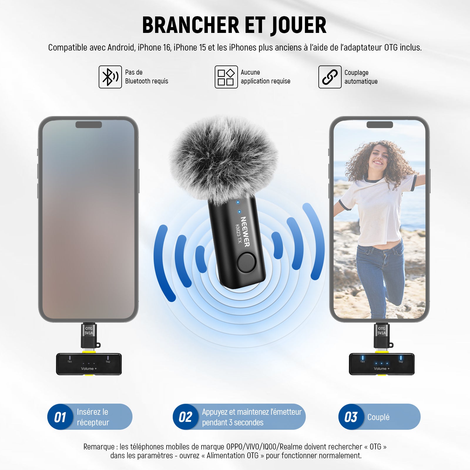 - 【Kit de micro-cravate sans fil professionnel pour USB C】 Le kit de microphone NEEWER est livré avec deux émetteurs (TX) et un récepteur (RX). Le récepteur est compatible avec iPhone 16 15 série, compatible avec Samsung Galaxy S24 S23 Ultra, téléphones Android, PC, ordinateurs portables et autres appareils avec une interface de type C. Les deux aimants inclus peuvent aider à fixer les clips de l'émetteur