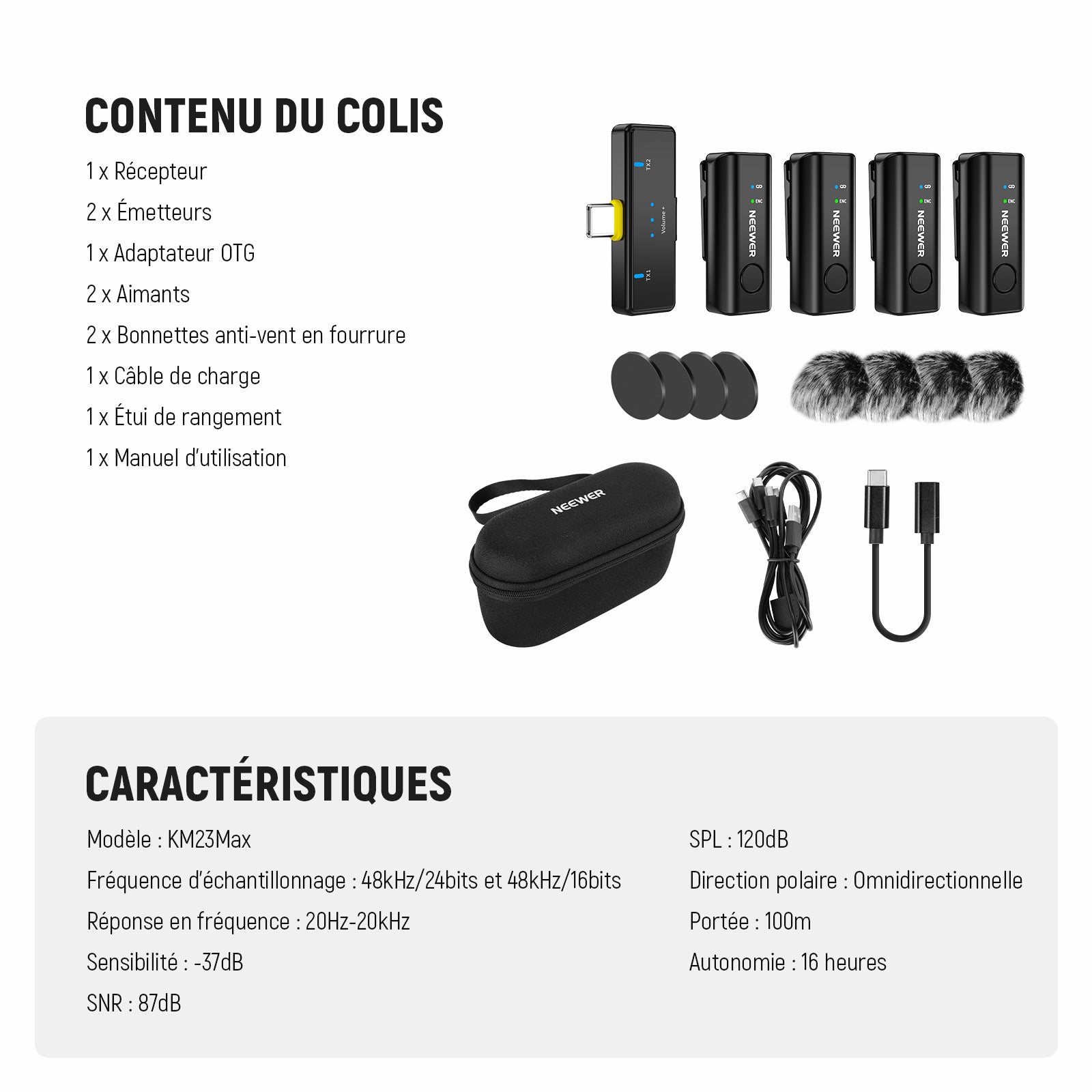 - 【Portée de 70m et autonomie totale de 32h】 Transmission stable de 70m (en avant) en 2,4G en champ libre. Chaque émetteur se recharge complètement en 1,5h et offre une autonomie de 8 heures (32h au total). Chargez complètement tous les microphones avant la première utilisation. Remarque : Certains téléphones nécessitent l'activation de la fonction OTG dans les paramètres