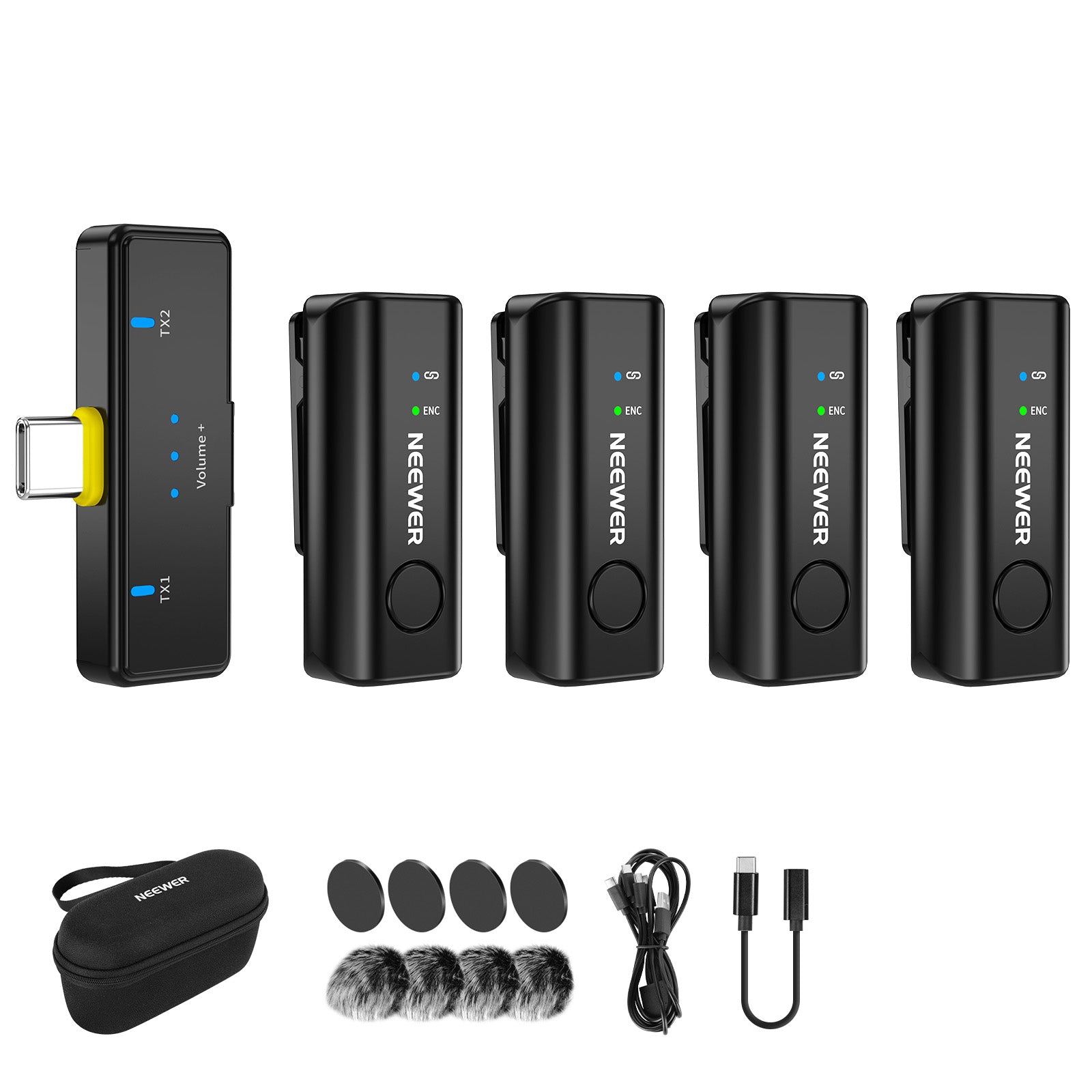 - 【Système de mini micro-cravate 1x RX + 4x TX】 Ce kit de micro-cravate sans fil compact, composé d'un récepteur (RX) et de quatre émetteurs (TX), permet d'enregistrer simultanément jusqu'à quatre personnes. L'adaptateur et le câble OTG sont compatibles avec iPhone iPad téléphones Android PC, ordinateurs et ordinateurs portables. Accessoires idéaux pour l'enregistrement vidéo, les podcasts, le streaming, le vlogging, etc. Remarque : Non compatible avec GoPro