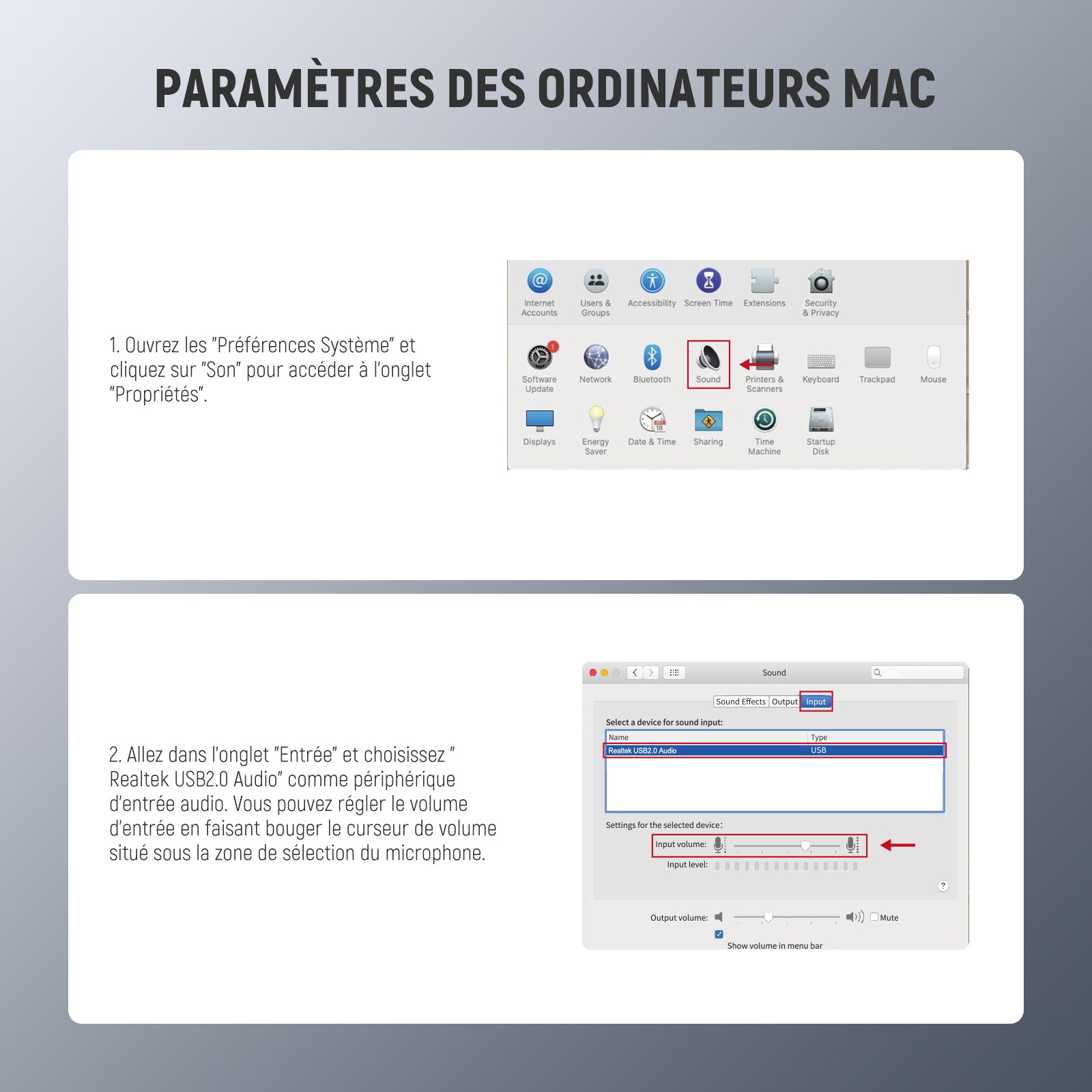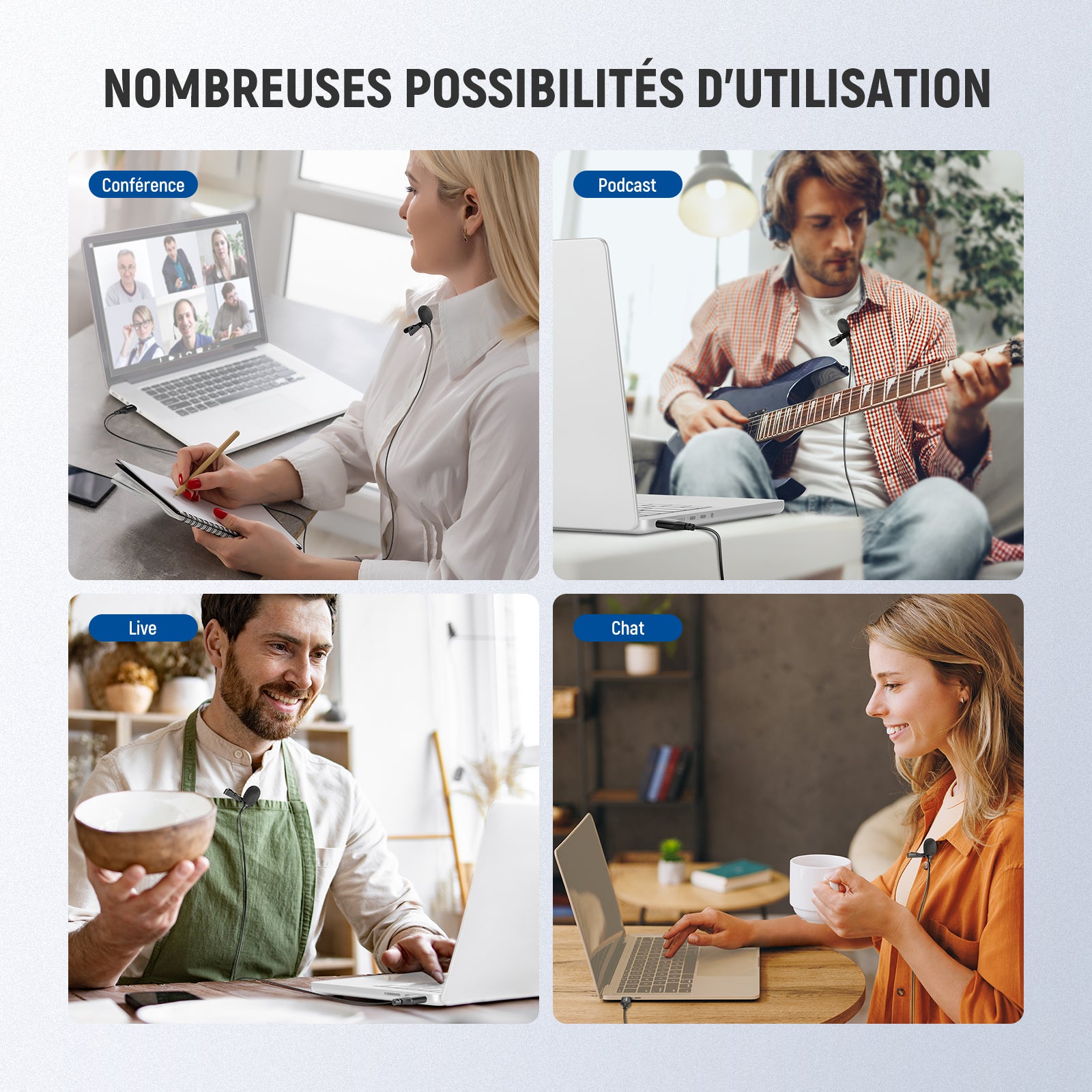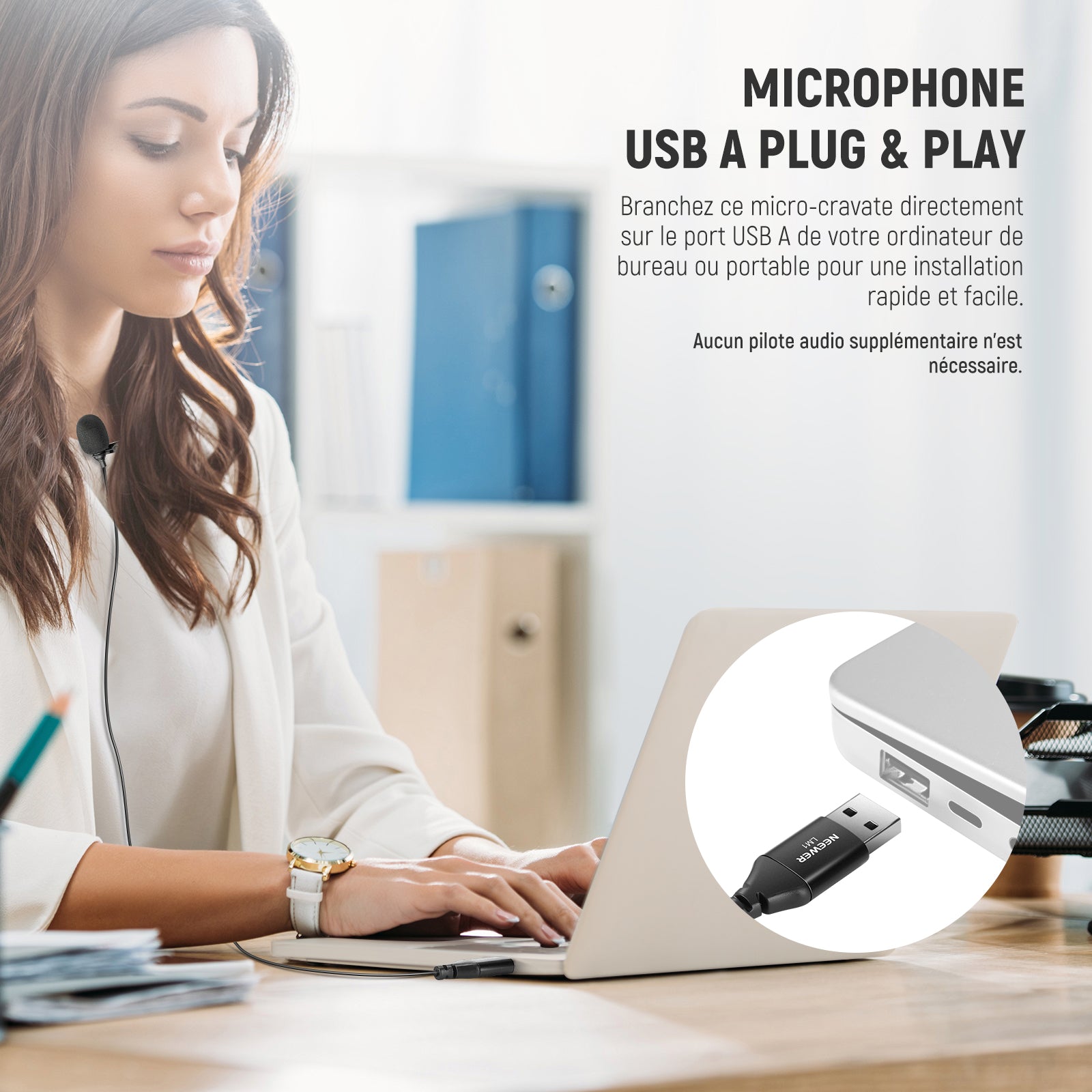 - 【Microphone USB A Plug & Play】 Branchez directement ce micro Lav sur le port USB A de votre ordinateur de bureau ou ordinateur portable pour une installation simple et rapide. Aucun pilote audio supplémentaire n'est nécessaire. Un cable de 2m/6,6ft permet de positionner le micro librement. Remarque : Sur certains ordinateurs, il peut être nécessaire de configurer manuellement le microphone USB en tant que périphérique d'entrée