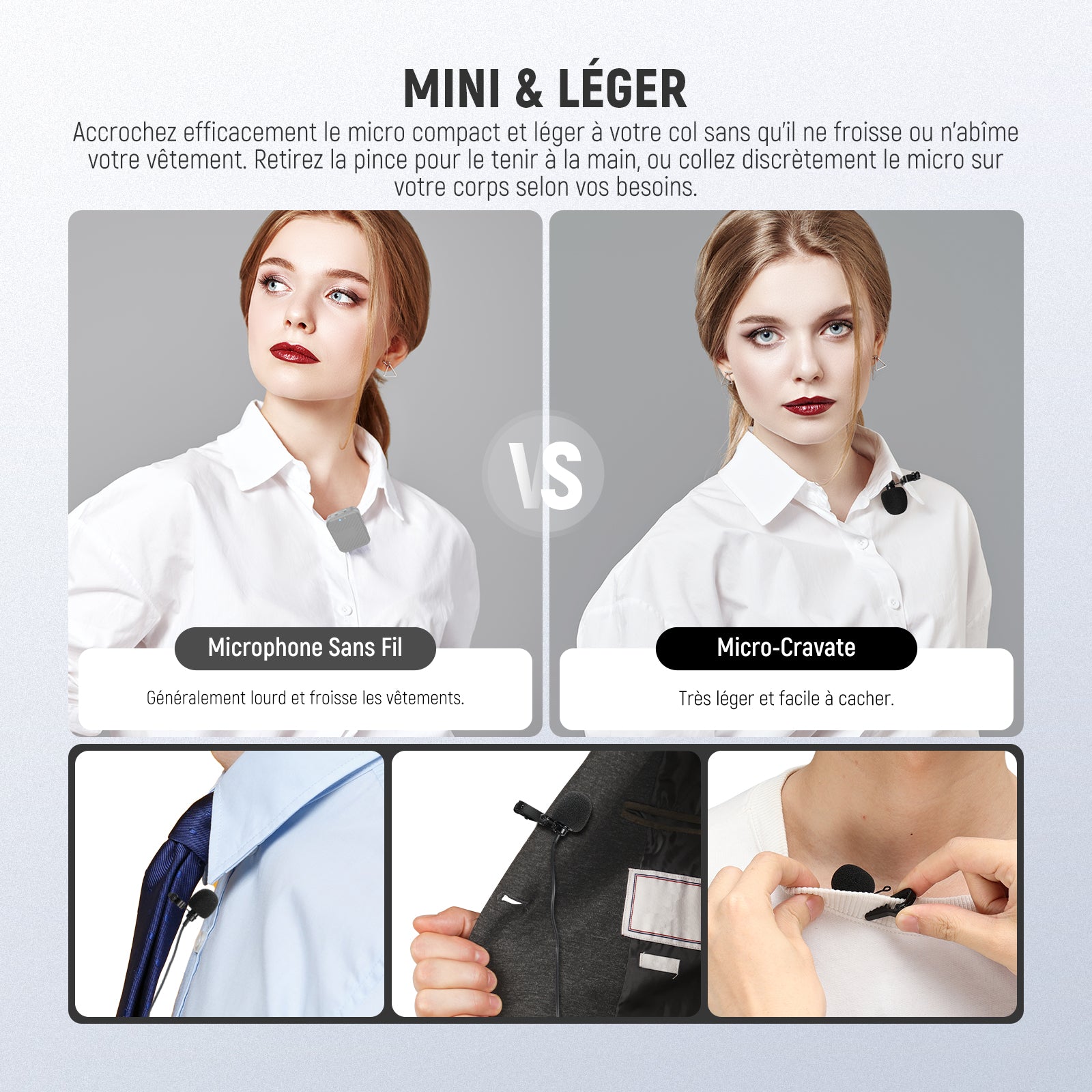 - 【Pince pour Col Sûre & Démontable】 Attachez solidement ce petit microphone léger à votre col sans qu'il n'affaisse ou ne froisse vos vêtements. Retirez la pince pour l'utiliser à la main ou fixez discrètement le micro sur votre corps avec du ruban adhésif selon vos besoins