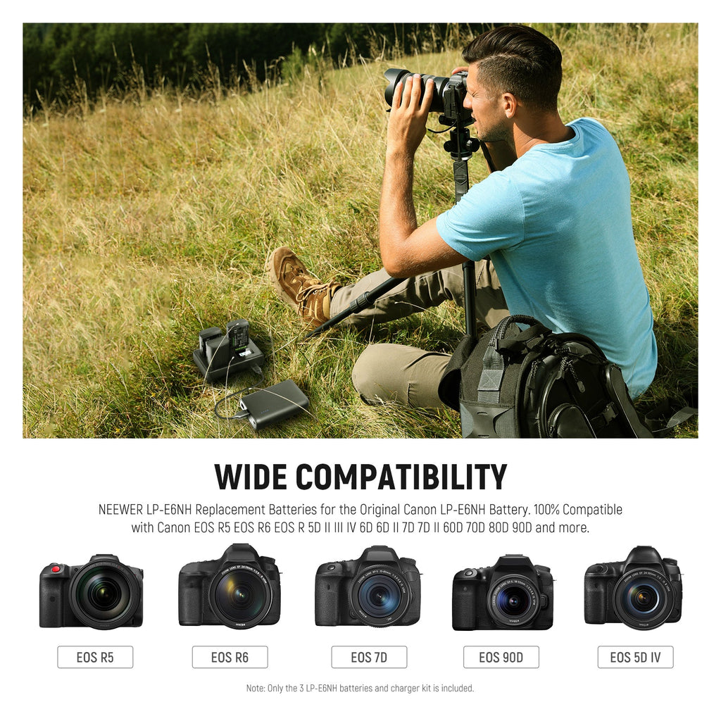 - 【Entièrement compatible avec les appareils photo Canon alimentés par une batterie LP-E6NH】 Les batteries de rechange NEEWER LP-E6NH sont compatibles avec les appareils photo Canon EOS R7 R5 EOS R6 EOS R 5D II III IV 6D 6D II 7D 7D II 60D 70D 80D 90D et autres appareils alimentés par Batterie LP-E6NH. Le chargeur est compatible avec les batteries Li-ion LP-E6NH et LP-E6
