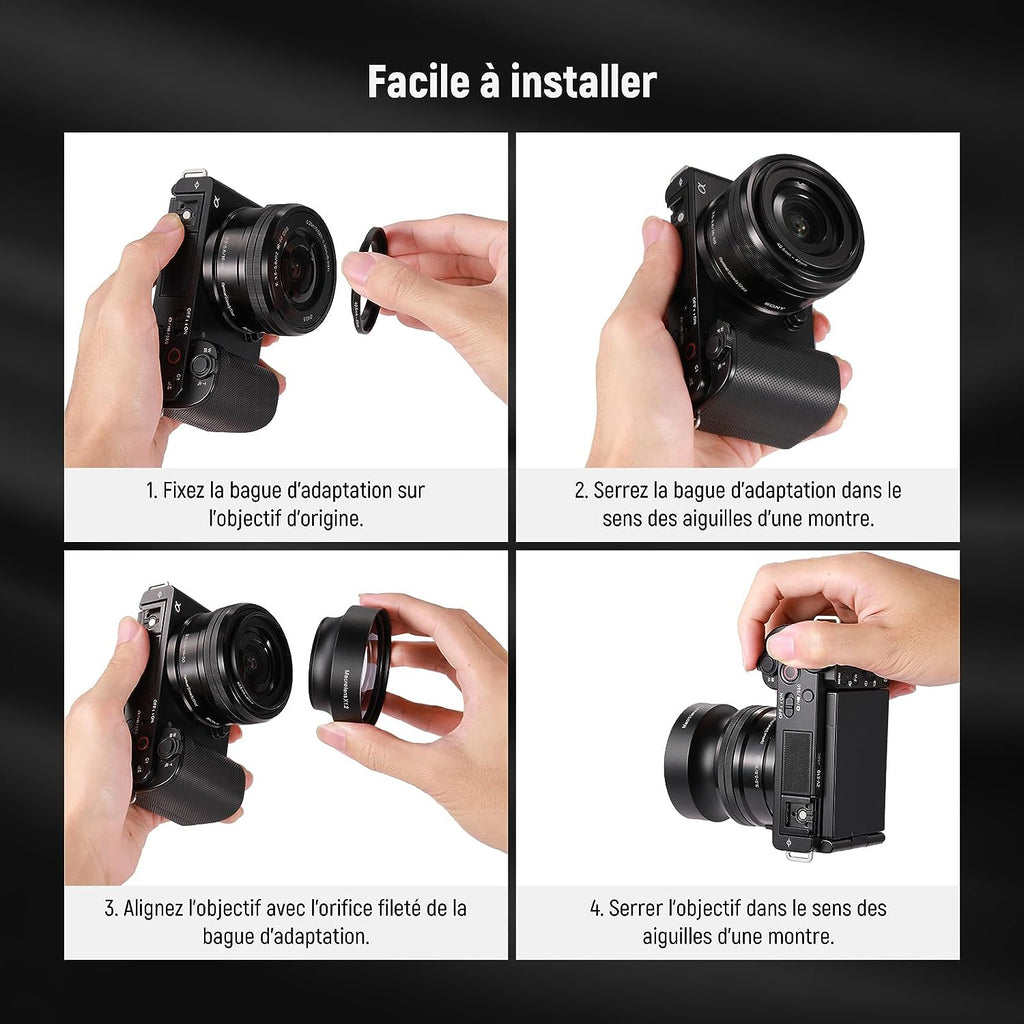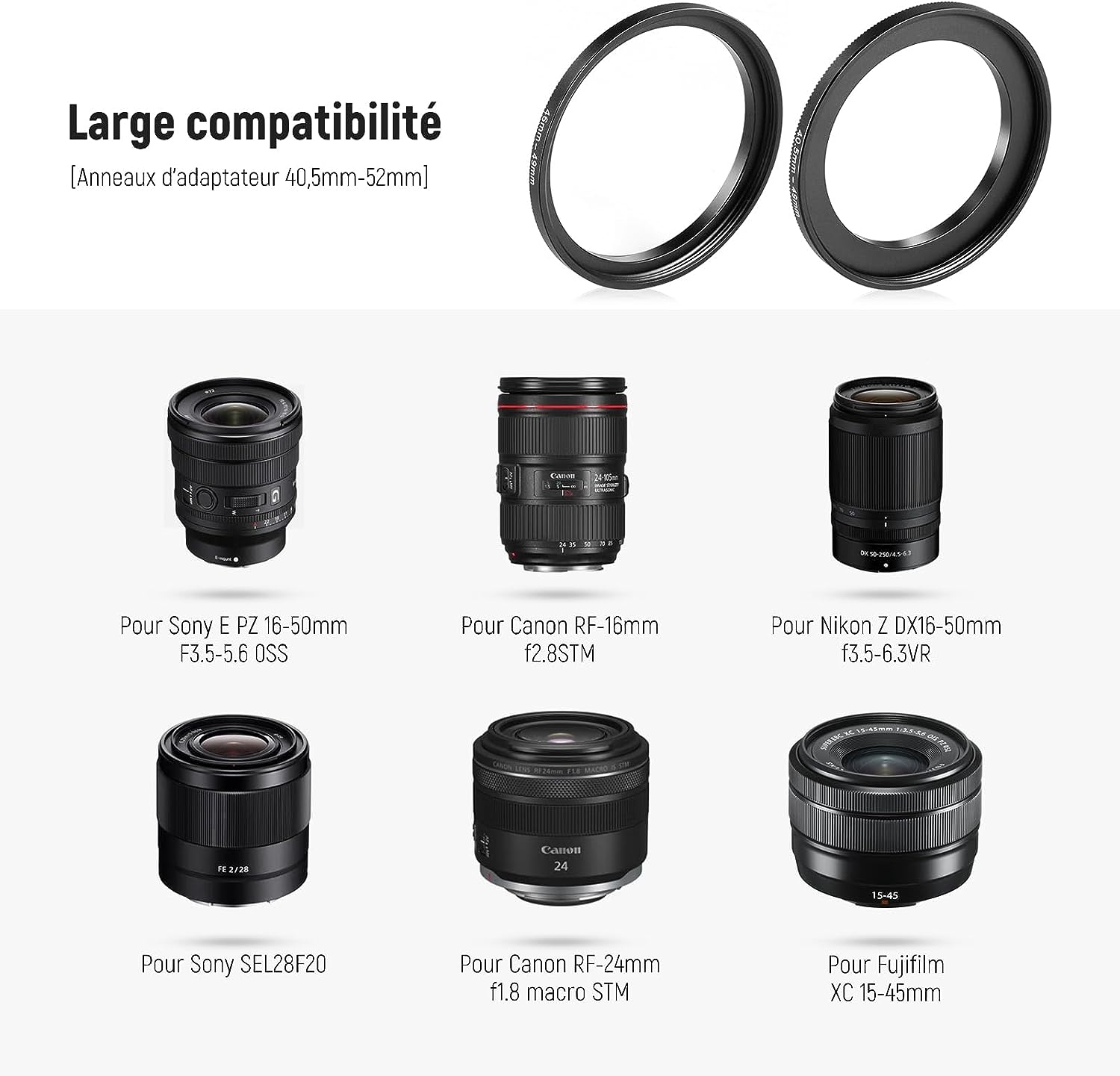 - 【Modèles d'Objectifs Compatibles】L'objectif s'adapte à de nombreux objectifs ø49mm, entièrement compatible avec Canon EF-M 15-45mm f3,5-6,3 IS STM Canon RF-M 18-45mm f3,5-6,3 IS STM Sony SEL50F18F Sony SEL28F20 Sony E 16mm F2,8. Livré avec deux annaux adaptateur, l'adaptateur 49-46mm est compatible avec Nikon Z DX16-50mm f3,5-6,3VR, et l'adaptateur 49-40,5mm est exclusivement compatible avec Sony E PZ 16-50mm F3,5-5,6 OSS et ne nécessite pas d'adhésif.