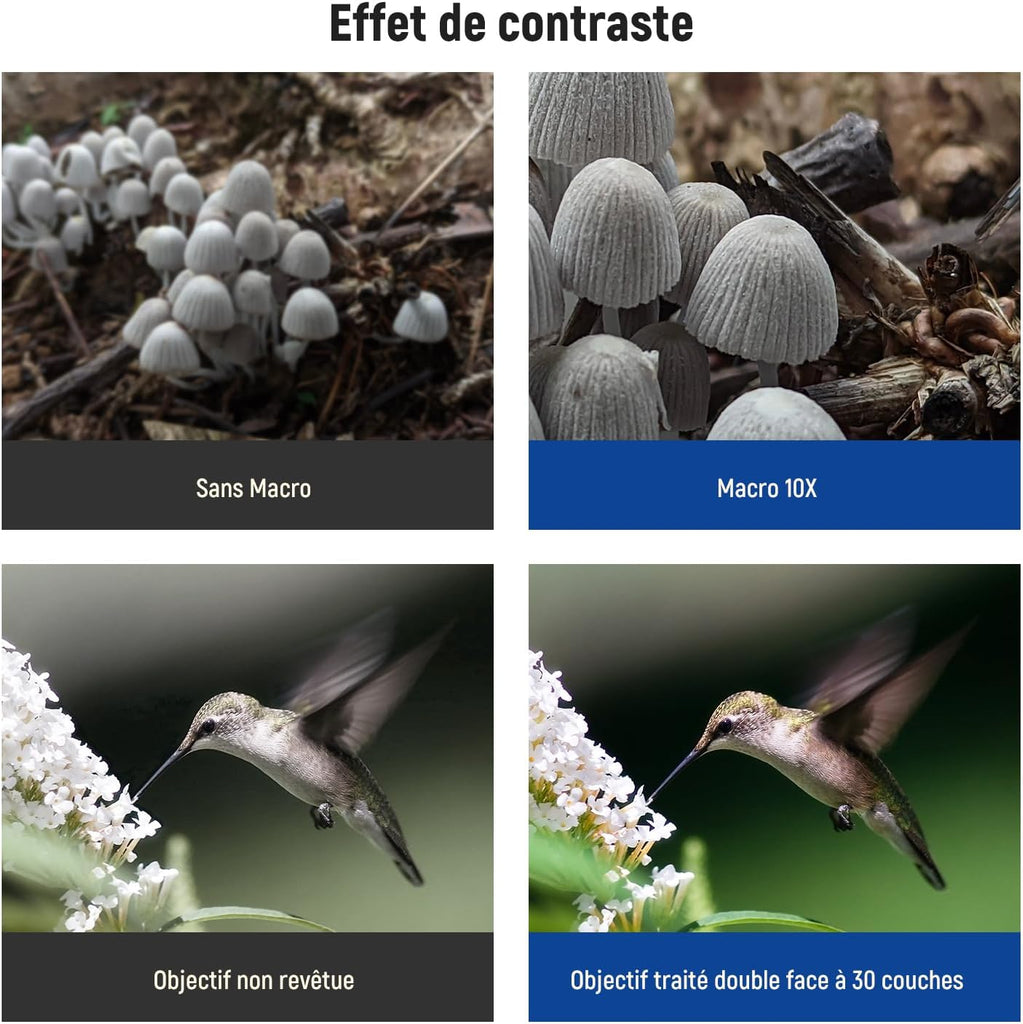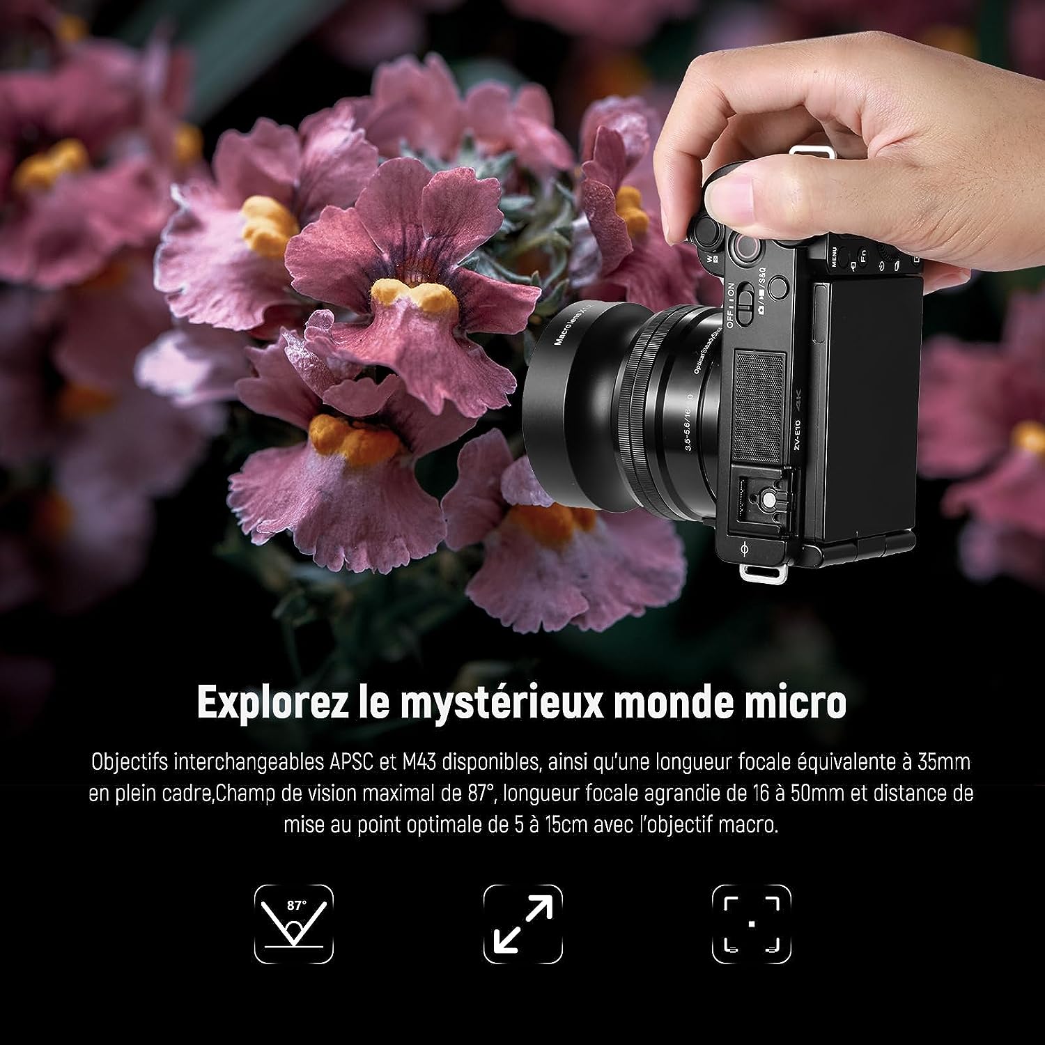 - 【3 Éléments en 3 Groupes】Il est fait de verres correcteurs optiques à 3 éléments en 3 groupes avec la conception apochromatique et le nano-revêtement pour donner une résolution élevée et des couleurs naturelles sans franges violettes/vertes. Il fournit des objectifs amovibles APSC&M43, sous la longueur focale équivalente 35mm plein cadre, un champ de vision maximal de 87°, une longueur focale de 16-50mm pour grossir, et une distance de mise au point optimale de 5-15cm pour les objectifs macro.