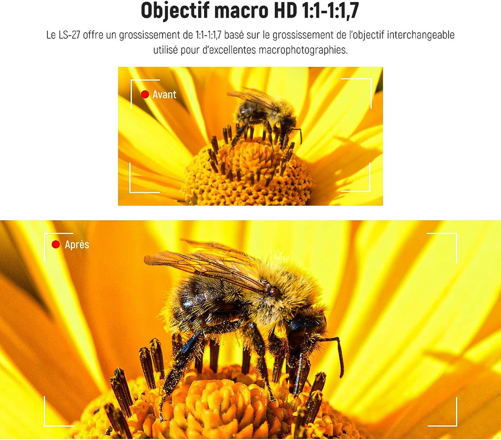 - 【Compact et Léger】Avec un poids de 133g, l'objectif n'ajoute aucune contrainte. Lorsqu'il est fixé à un objectif d'appareil photo interchangeable, le LS-27 permet une mise au point plus rapprochée que la distance de mise au point minimale de l'objectif d'origine.