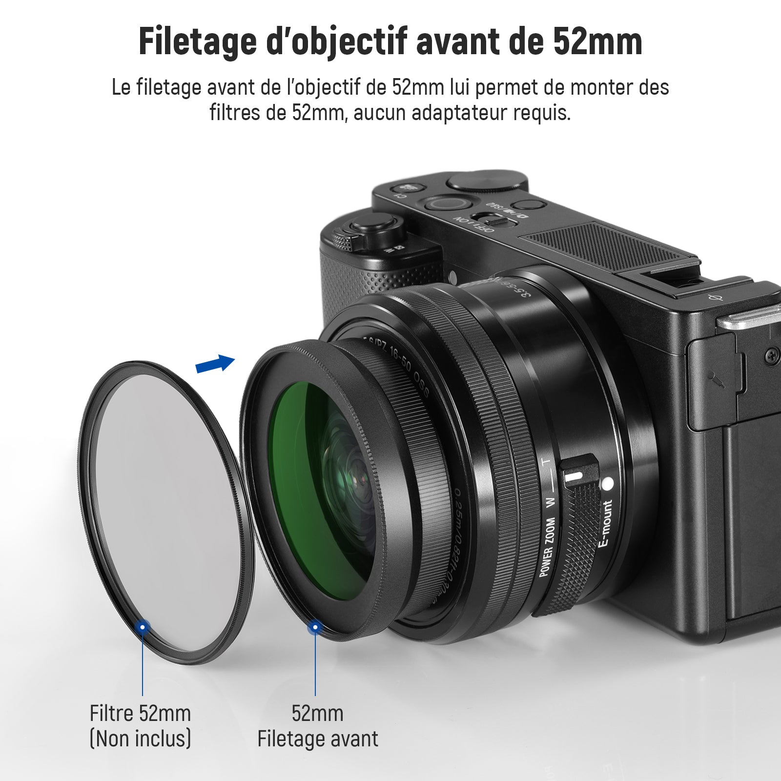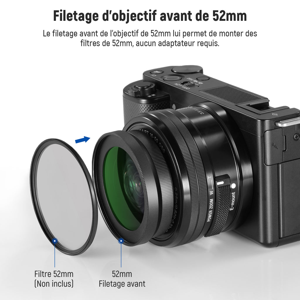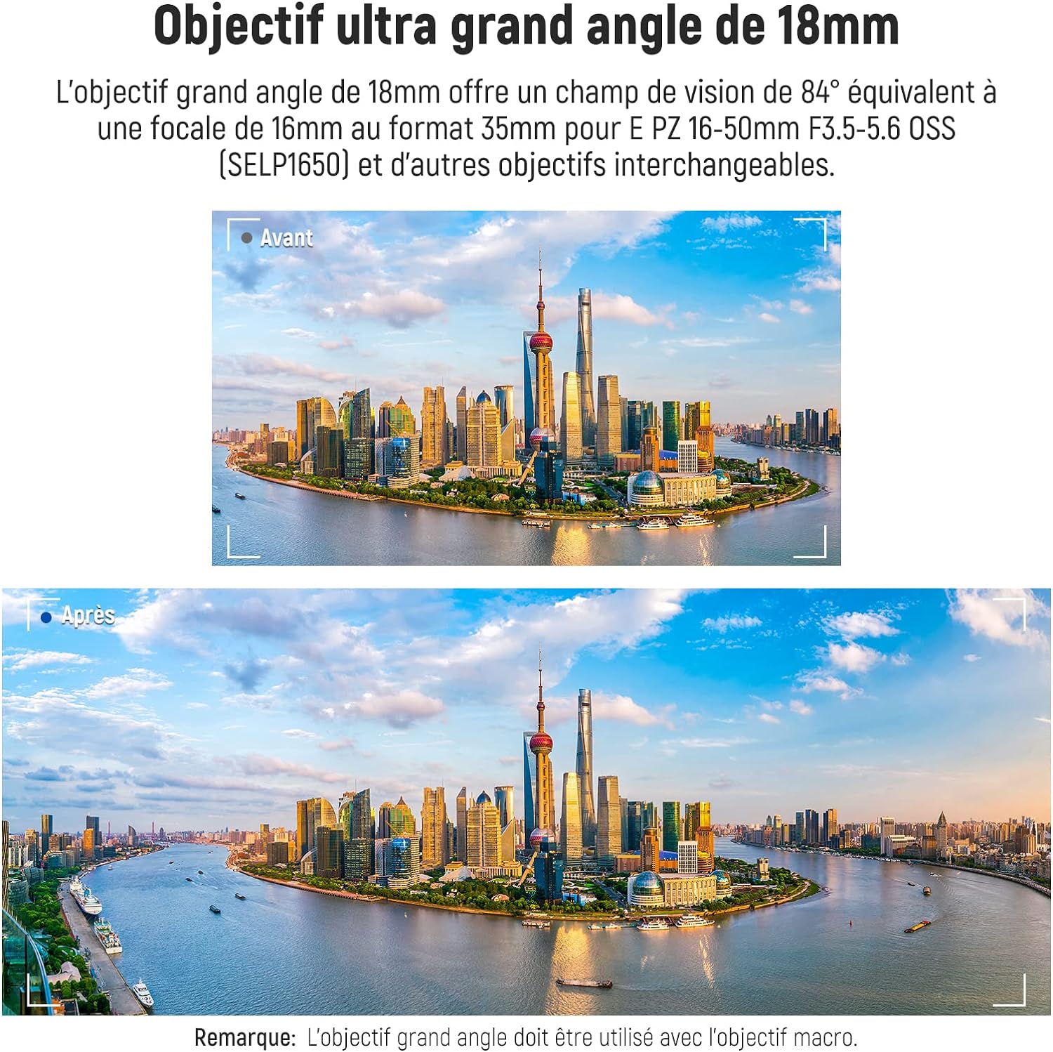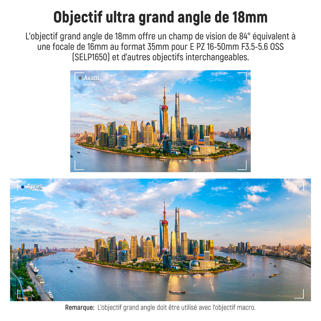 - 【Objectif ultra grand angle 18mm】 L'objectif grand angle 18mm offre un champ de vision de 84 degrés équivalent à une distance focale de 16mm au format 35mm pour E PZ 16-50mm F3.5-5.6 OSS (SELP1650) et d'autres objectifs interchangeables. Remarque: L'objectif grand angle doit être utilisé avec l'objectif macro