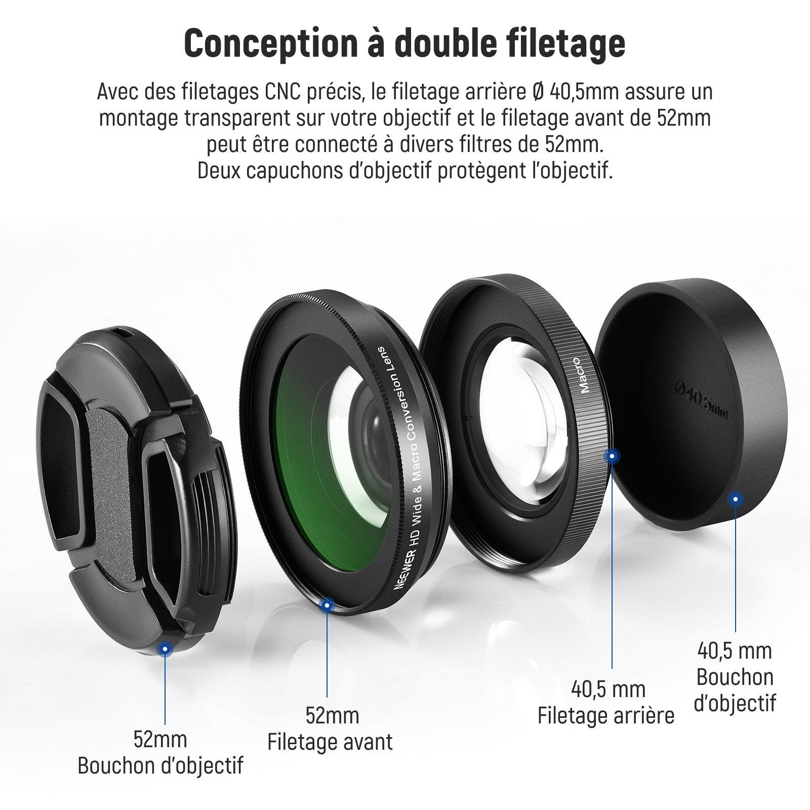 - 【Conception légère et double filetage】 Le cadre de l'objectif est fabriqué en aluminium anodisé et ne pèse que 70g, léger et durable. Avec des filetages usinés CNC précis, le filetage arrière Ø40,5mm assure un montage sans couture sur votre objectif et le filetage avant de 52mm peut être connecté à divers filtres de 52mm
