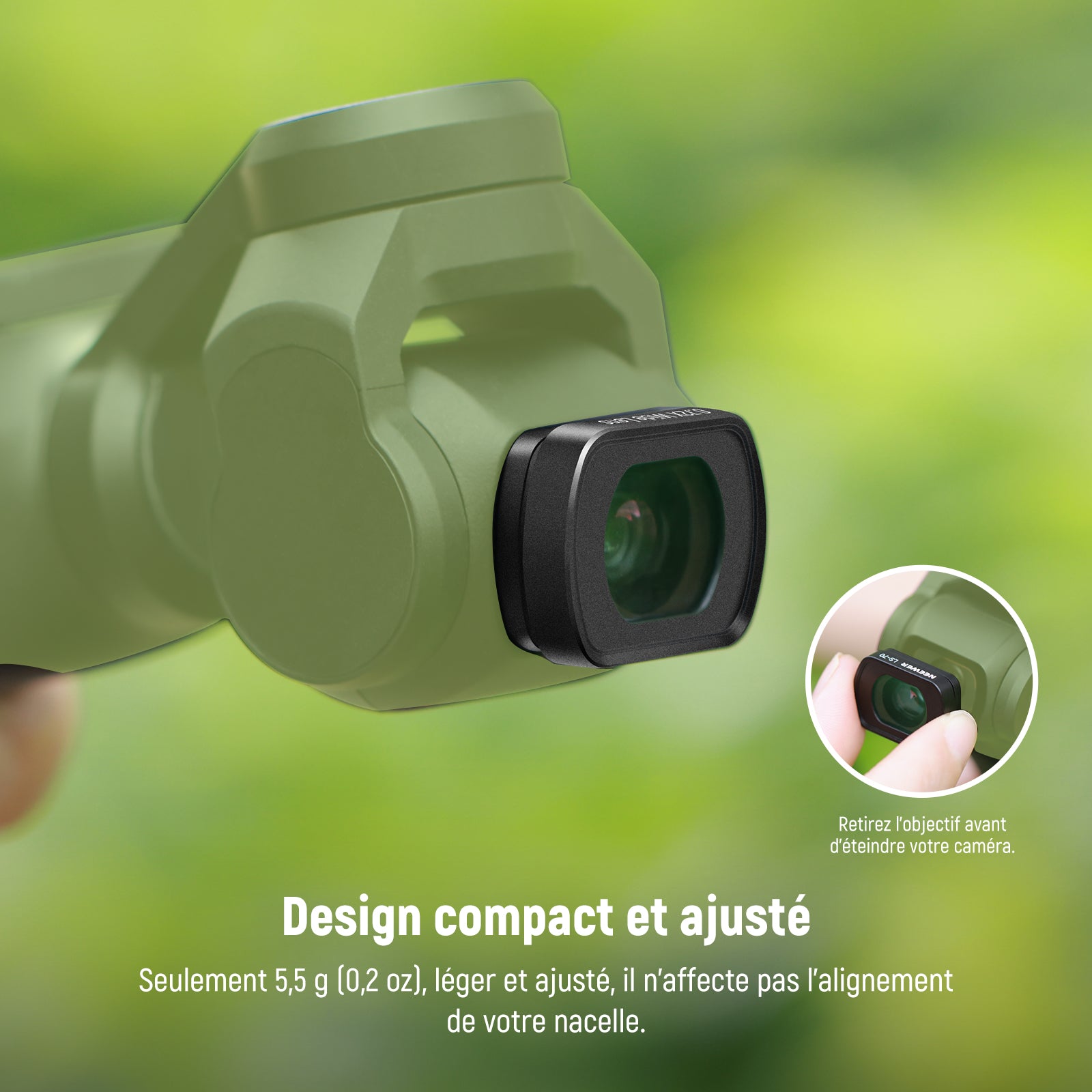 - 【Fixation magnétique rapide】 L'installation est simple. Il suffit d'accrocher cet objectif magnétique léger (5,4 g) à votre appareil photo et de commencer à prendre des photos. Remarque : retirez l'objectif avant de ranger le gimbal.
