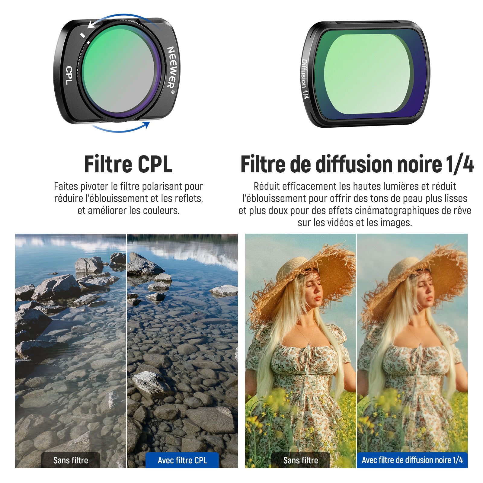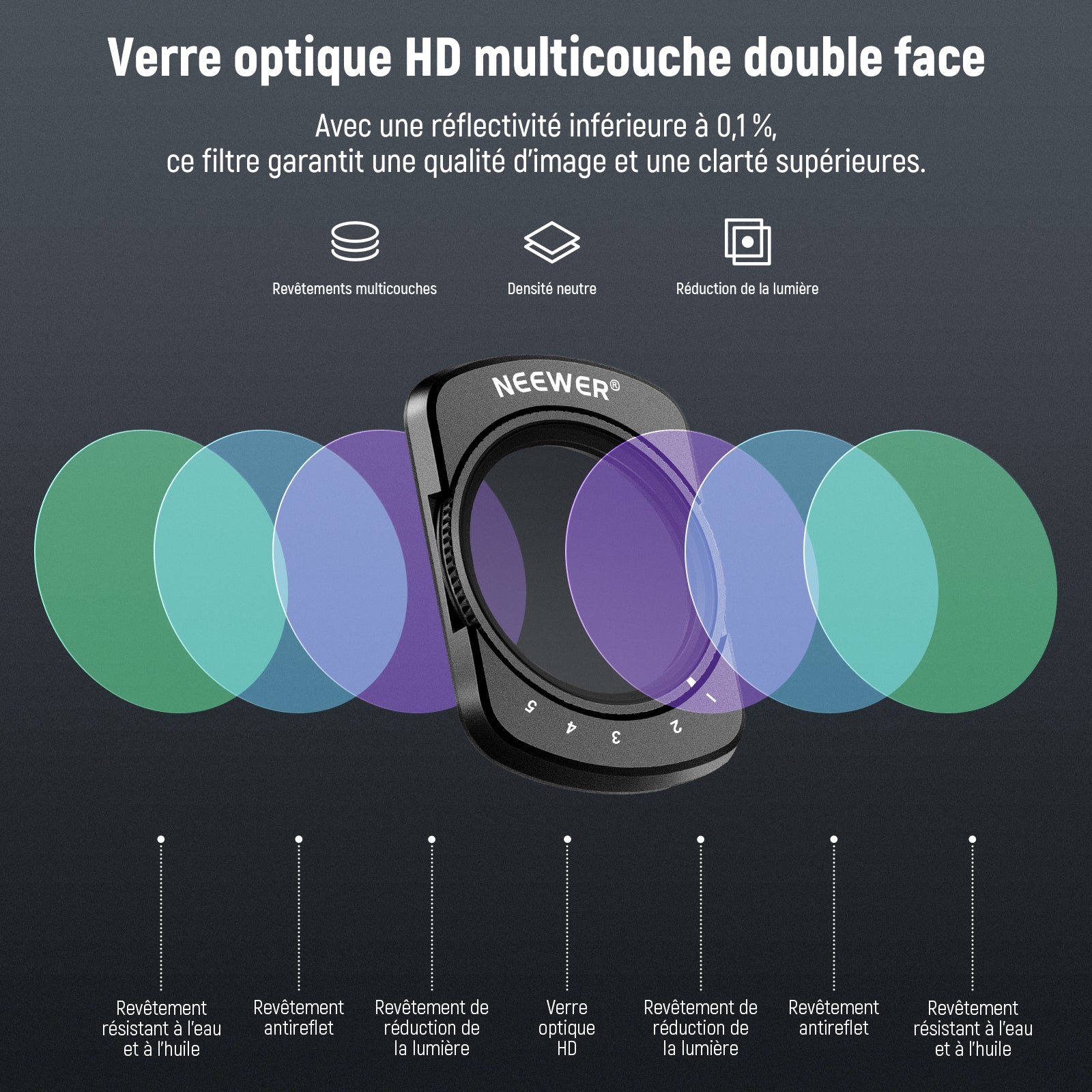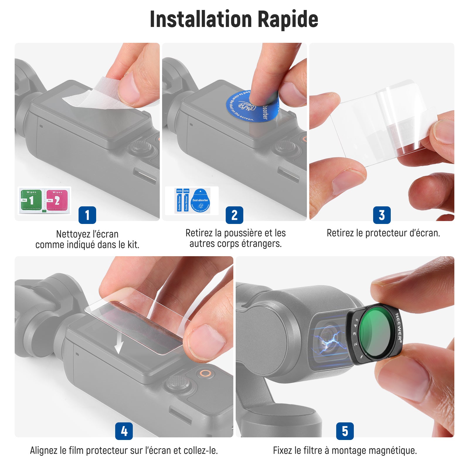 - 【Entièrement compatible avec DJI Osmo Pocket 3 et installation magnétique】 Le lot de filtres magnétiques NEEWER est compatible avec DJI OSMO Pocket 3. Les filtres disposent d'une fixation magnétique instantanée et sécurisée, permettant une installation rapide et facile. Il suffit de clipser le filtre sur l'objectif et il restera fermement en place. Remarque : si un film protecteur est appliqué sur l'objectif, il peut interférer avec le stockage du cardan