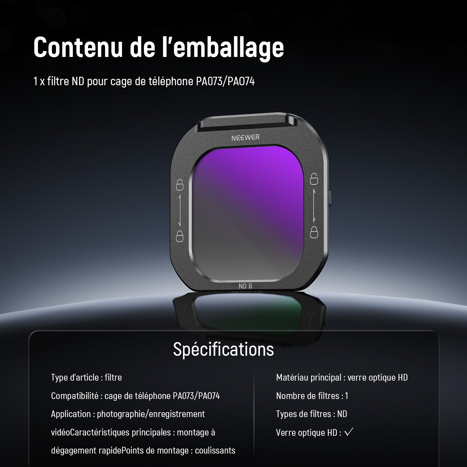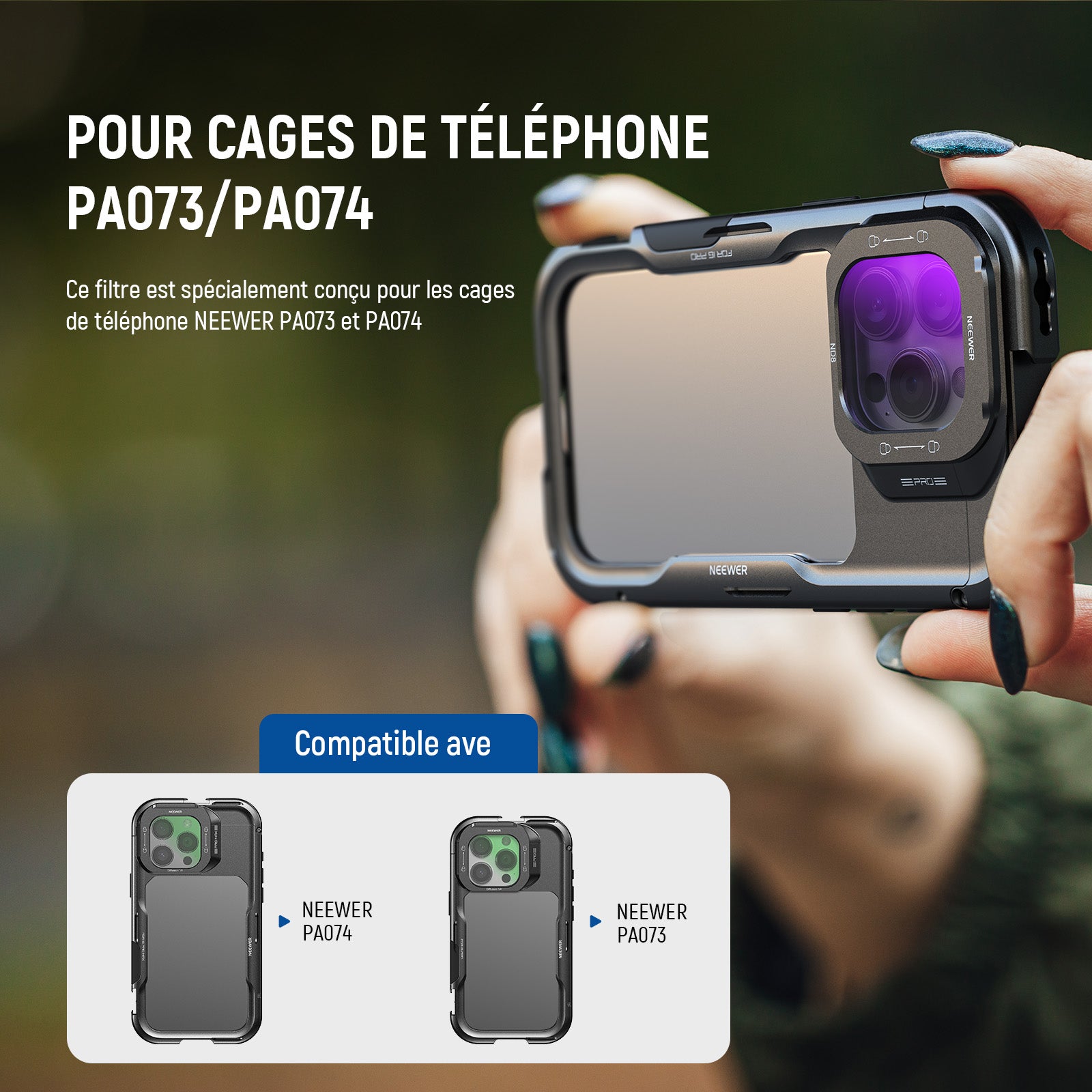 - Pour cage de téléphone PA073/PA074 UNIQUEMENT: Ce filtre est uniquement compatible avec les cages de téléphone NEEWER PA073 (pour iPhone 16 Pro) et PA074 (pour iPhone 16 Pro Max). Il ne fonctionne pas avec les cages de téléphone pour d'autres modèles