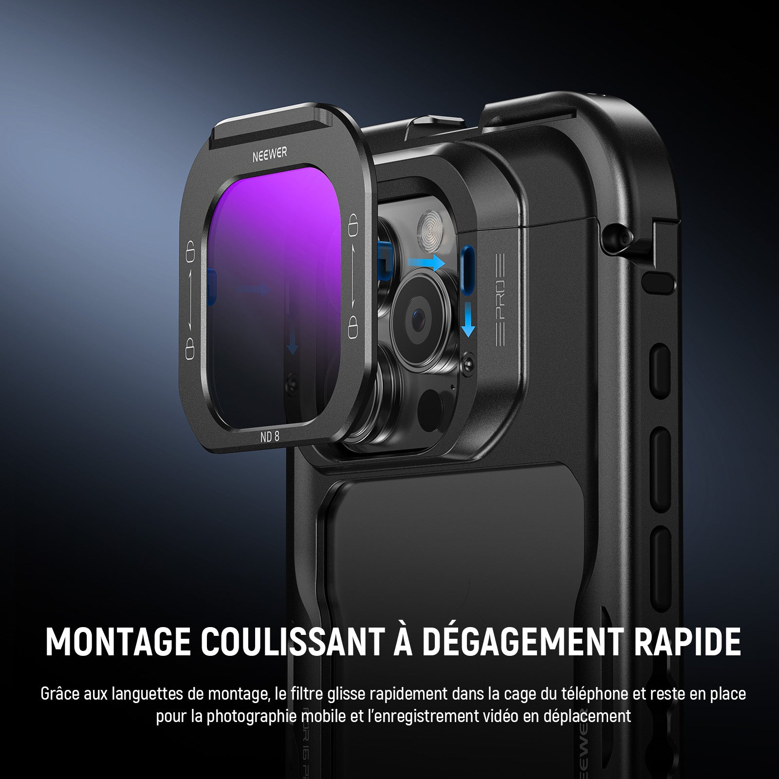 - Montage coulissant à dégagement rapide : grâce aux languettes de montage, le filtre glisse rapidement dans la cage du téléphone et reste en place pour la photographie mobile et l'enregistrement vidéo lors de vos déplacements