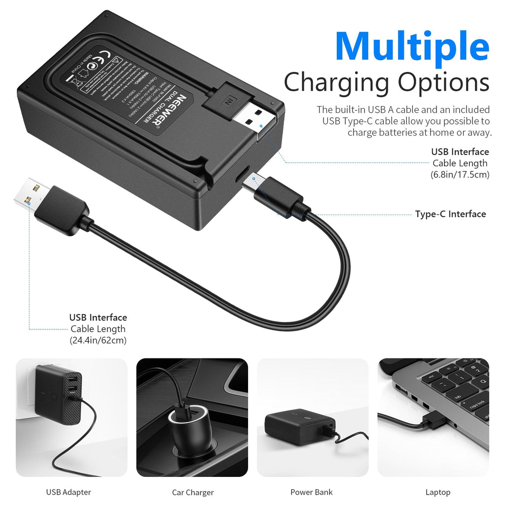 - 【Chargeur USB Pratique】 Le chargeur USB à double fente peut charger deux batteries en même temps. Le câble de charge Type-C inclus s'alimente à partir de prises murales, de banques d'alimentation, de chargeurs de voiture et de ports USB sur votre ordinateur. L'entrée 8,4V/1A peut recharger les piles à 100% en quelques heures seulement.