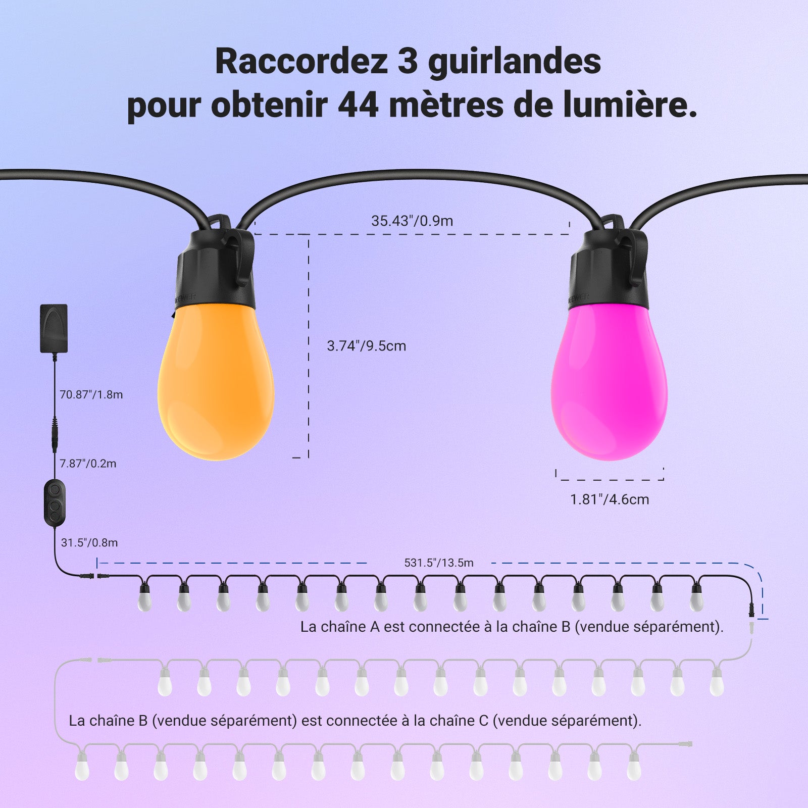 • Longueur : 30 m (96 ft) (15 m / 48 ft par guirlande)