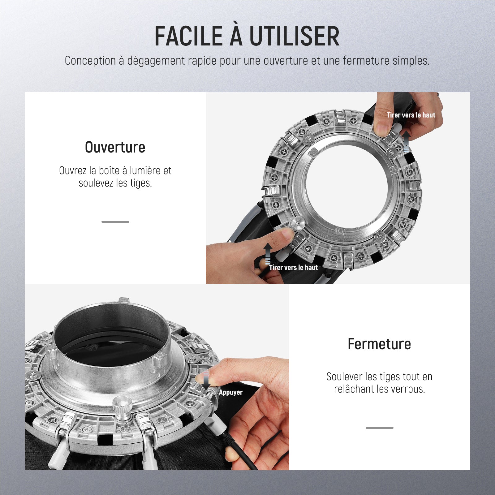 - 【Libération et pliage rapides】 Grâce à sa structure intégrée, la boîte à lumière permet une ouverture et une fermeture instantanées en quelques secondes. Faites l'expérience d'un contrôle de l'éclairage transparent au bout de vos doigts, ce qui vous permet d'économiser du temps et des efforts. C'est une alternative plus pratique et plus efficace que les versions traditionnelles