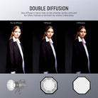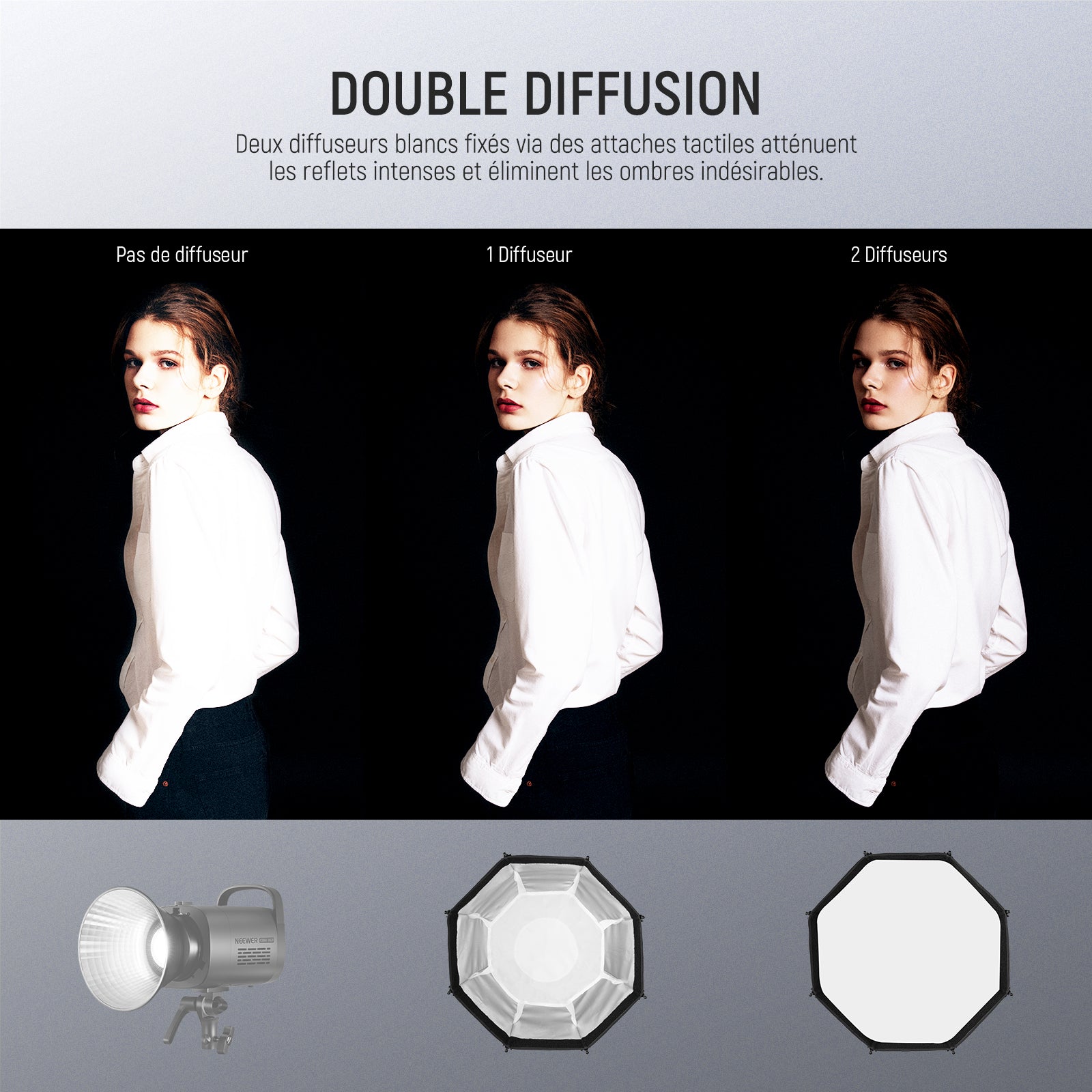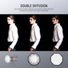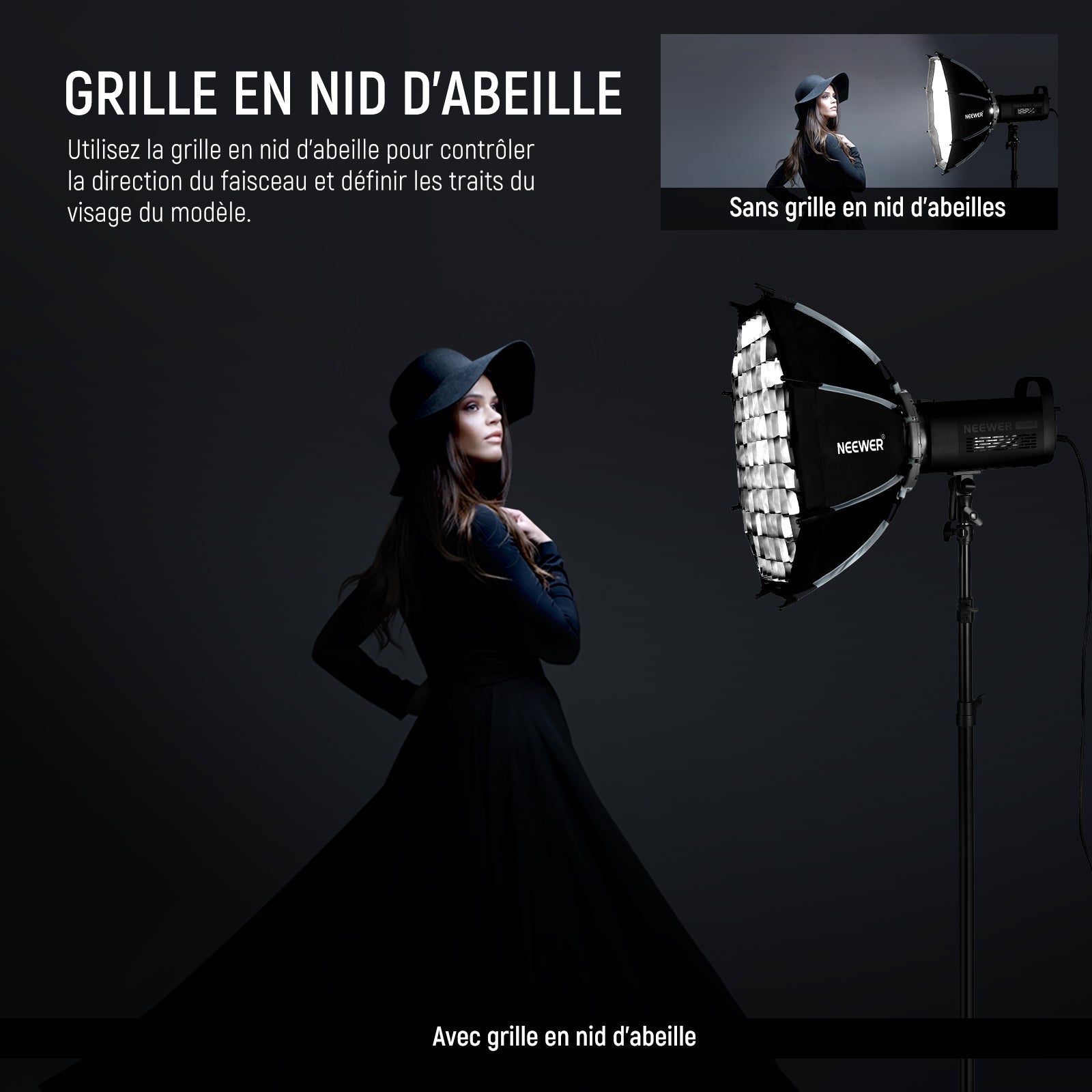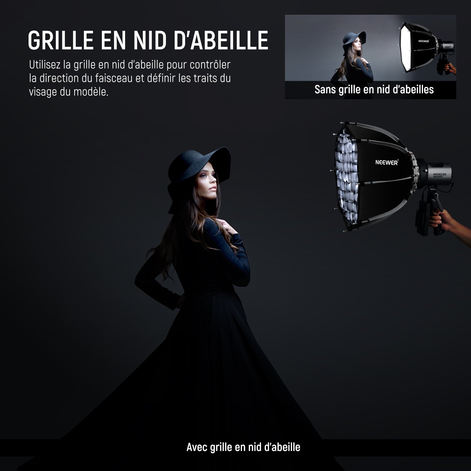 - 【Grille en nid d'abeille et diffuseurs】 La grille en nid d'abeille peut rendre la forme de la lumière confinée et directionnelle, donnant un effet de lumière dramatique et expressif pour définir la structure du visage du modèle. Deux diffuseurs de qualité peuvent être combinés ou utilisés séparément pour des effets différents