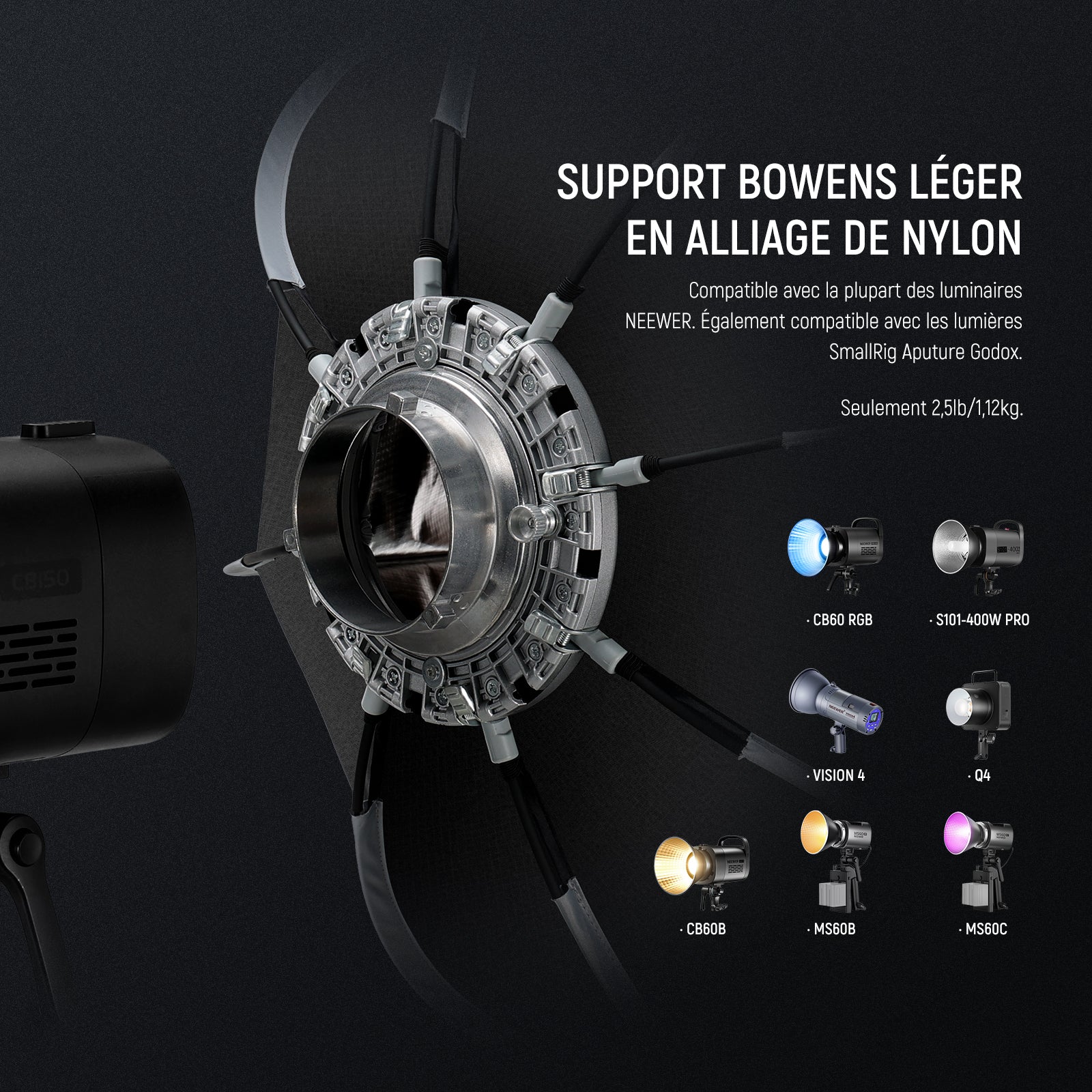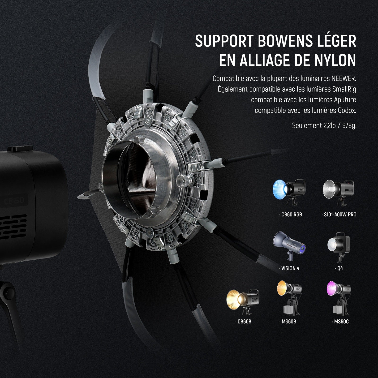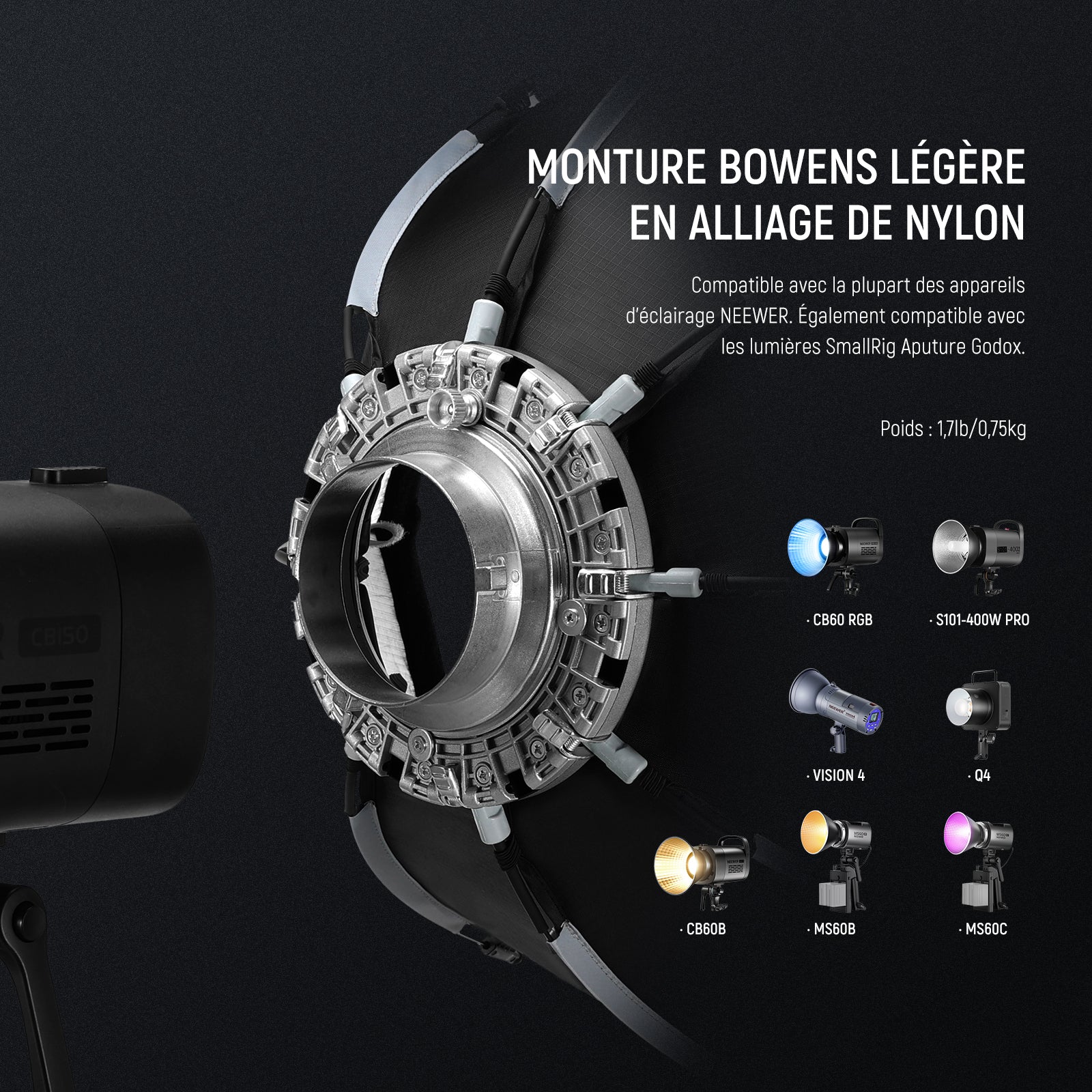 - 【Monture Bowens standard】 Grâce à la monture Bowens standard, cette boîte à lumière peut être fixée à de nombreuses monolampe NEEWER, à des lumières vidéo continues et à des monolampe à flash stroboscopique, telles que CB60, CB100, CB150, CB60B, RGB CB60, CB200B, MS60B, MS60C, MS150B, S101-300W/400W Pro, Vision 4, Q4. Compatible avec SmallRig compatible avec Aputure 120d, etc.