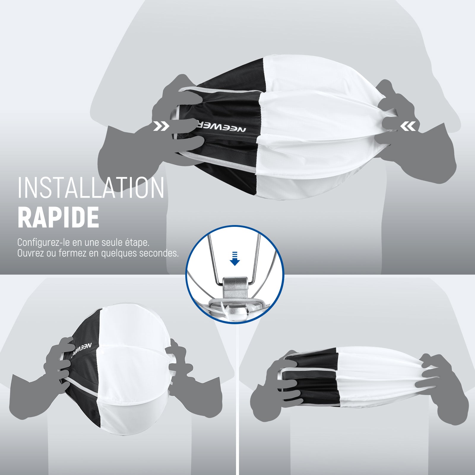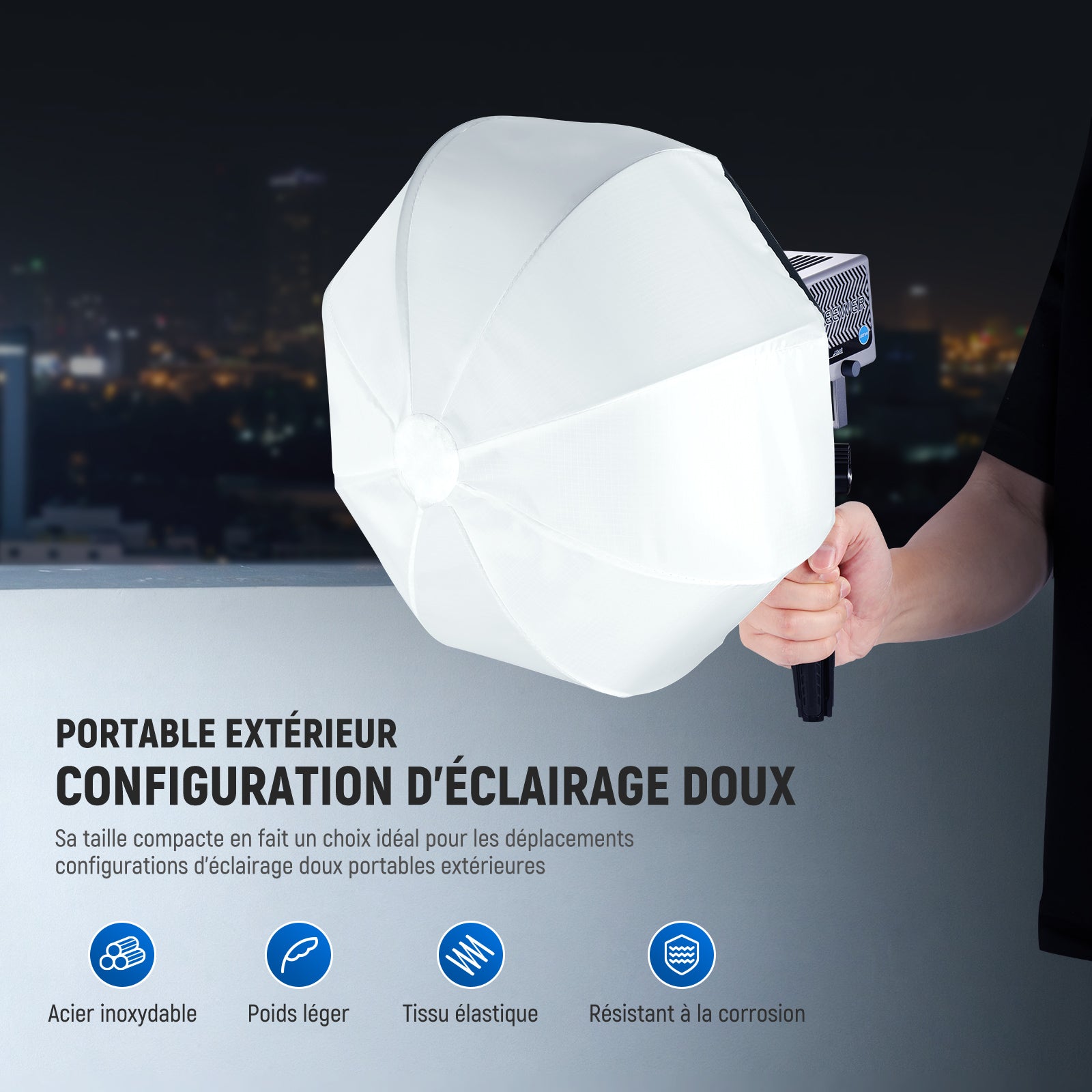 - Dégagement et pliage rapides en une étape- Conçue avec une structure intégrée, la softbox permet une ouverture et une fermeture instantanées en une seule étape simple, plus pratique et efficace que les versions traditionnelles, garantissant un contrôle transparent de l'éclairage du bout des doigts et vous faisant gagner du temps et des efforts