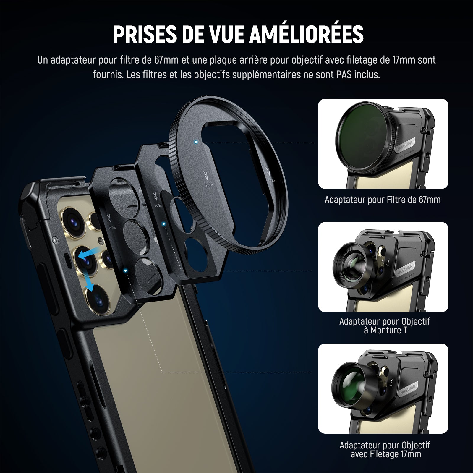 - 【Compatible avec Galaxy S24 Ultra】Conçu pour Samsung Galaxy S24 Ultra, ce rig vidéo pour téléphone en alliage d'aluminium résistant comprend un adaptateur pour filtre de 67mm, une plaque arrière pour objectif à filetage de 17mm et une plaque arrière pour objectif à monture T pour l'enregistrement vidéo, le vlogging, le streaming en direct sur YouTube/TikTok, la photographie mobile et la réalisation de films.