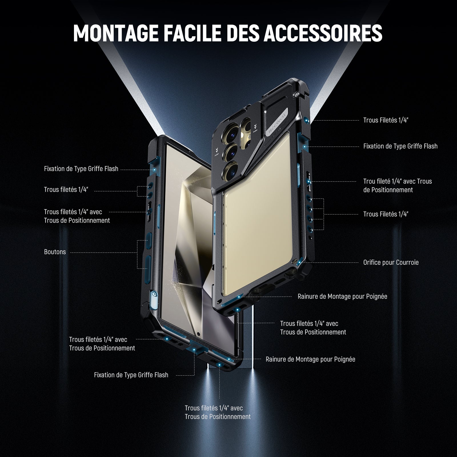 - 【 Installation en 1 Clic & Accès Total】Cette cage de téléphone s'ouvre et se ferme rapidement grâce à un bouton sur le côté. Elle est parfaitement adaptée au S24 Ultra et ne bloque pas l'appareil photo, le port de charge et les boutons. Doublée de protections en caoutchouc qui absorbent les chocs. C'est un stabilisateur polyvalent qui protège le téléphone, parfait pour l'enregistrement de vidéos en intérieur et en extérieur.