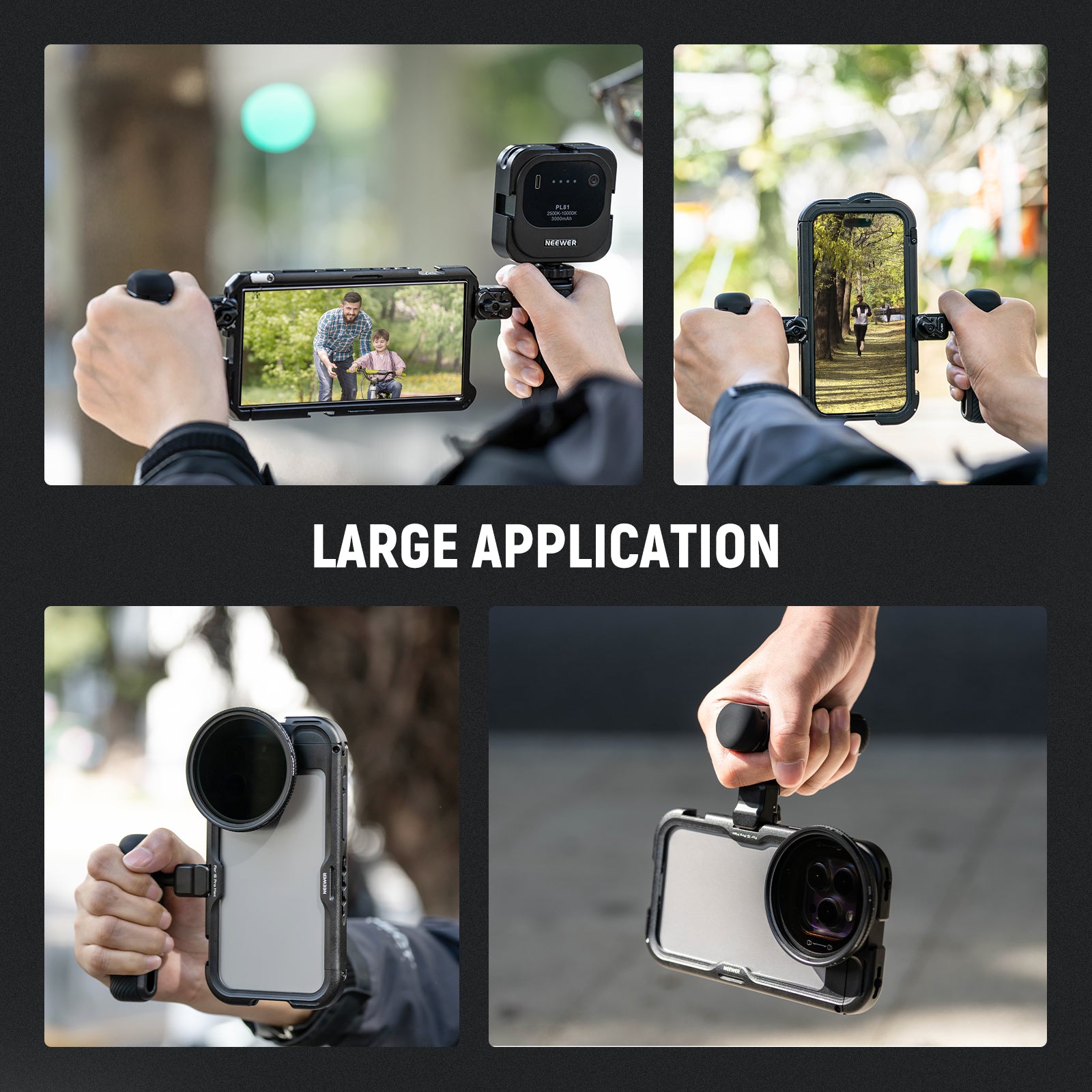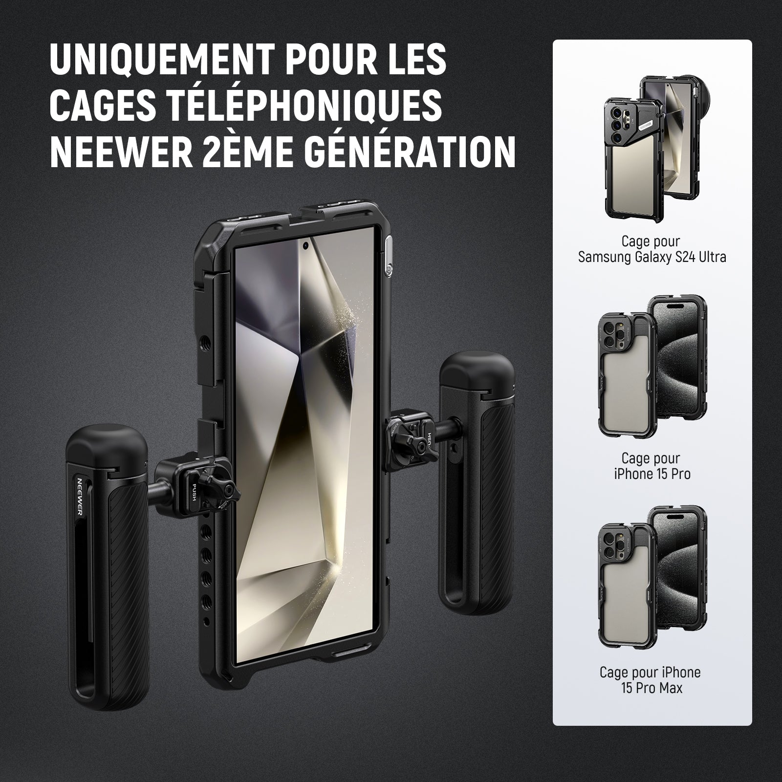 - Pour les cages pour téléphone avec slots à libération rapide - Cette poignée latérale est spécialement conçue pour les cages pour téléphone NEEWER avec des slots de libération rapide dédiés, y compris PA143/PA144 pour iPhone 17 Pro/Pro Max, PA073/PA074 pour iPhone 16 Pro/Pro Max, PA043/PA044 pour iPhone 15 Pro/Pro Max, et PA042 pour Samsung Galaxy S24 Ultra