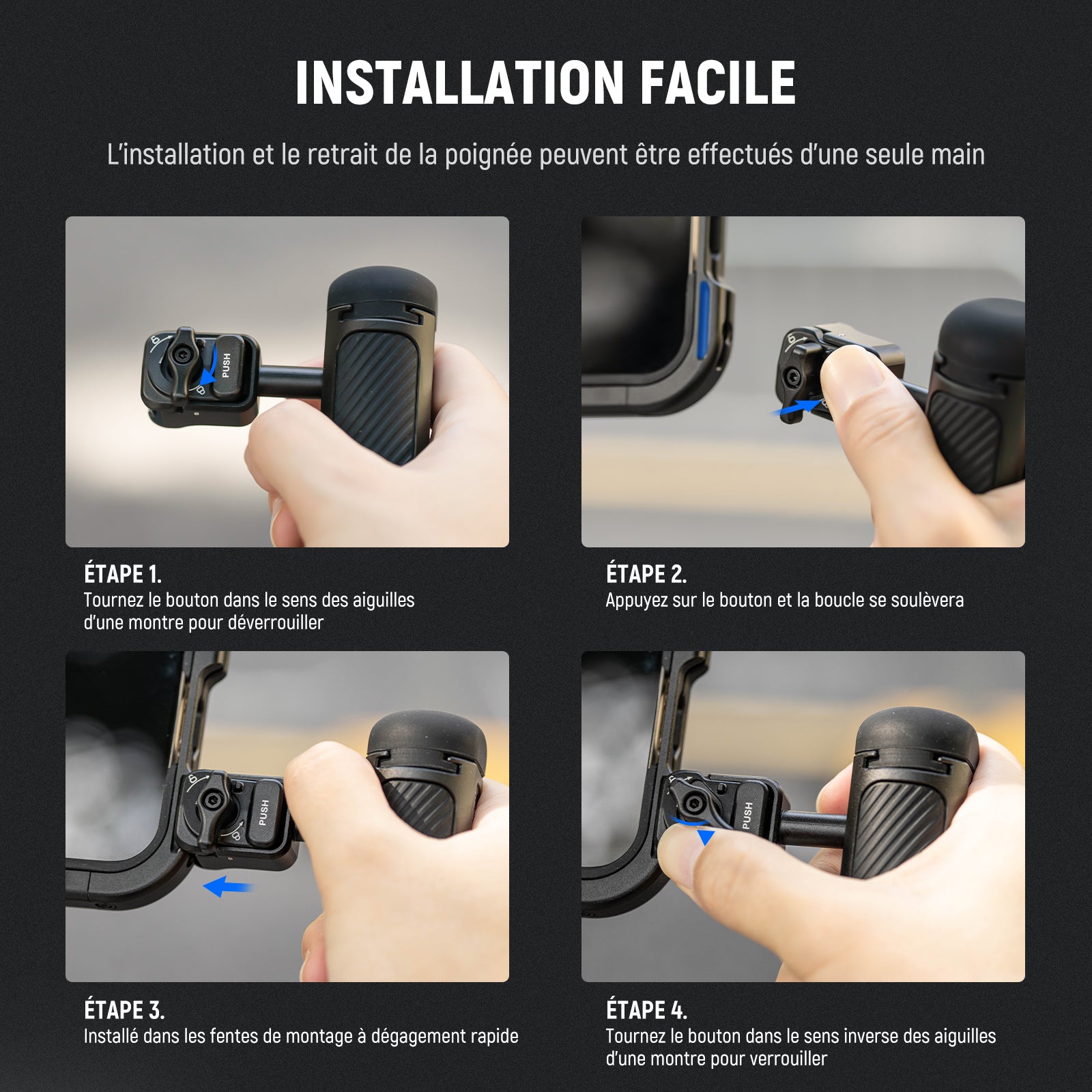 - Installation par pince à dégagement rapide: Dotée d'une pince à dégagement rapide, la poignée latérale peut se fixer rapidement à la cage du téléphone et être sécurisée avec un tour du bouton de verrouillage, parfait pour l'enregistrement vidéo en plein air, la réalisation de films, le vlogging, le streaming en direct, la photographie mobile et d'autres activités où le temps est limité