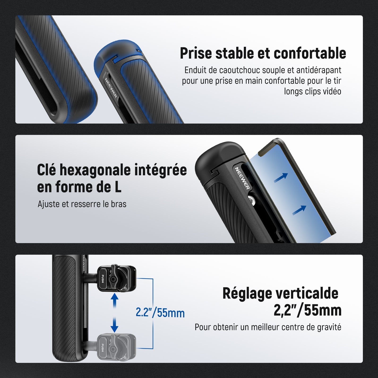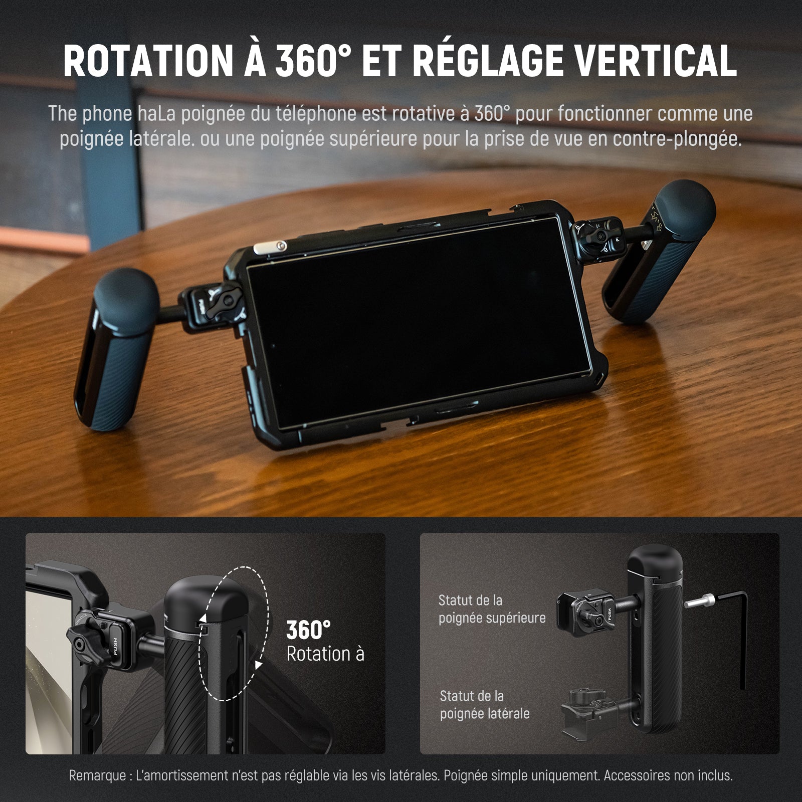 - Pivote à 360° et réglage vertical : avec une rotation à 360°, la poignée de téléphone peut servir de poignée supérieure pour les prises de vue à faible angle. Réglage vertical de 55 mm permettant un meilleur équilibrage