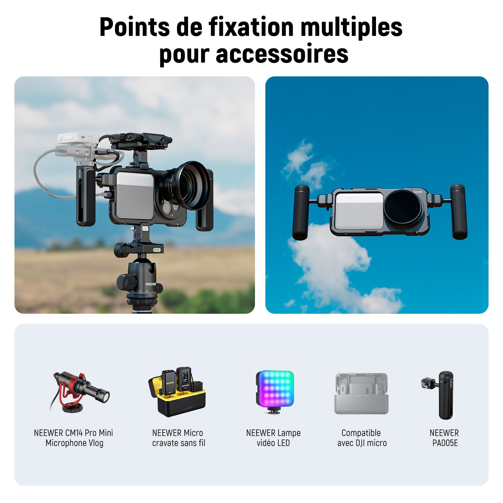 - 【Points de fixation】 Avec 1/4" Filetages et fixations pour griffe porte-accessoires.Cage peut être connectée à la poignée latérale à dégagement rapide PA045,aux poignées latérales doubles PA026,à la poignée latérale PA005E avec déclencheur sans fil Bluetooth,à la mini-lampe vidéo LED PL81,à la lampe RGB61/RGB62,au microphone cravate sans fil CM22/CM28,au mini-microphone vlog CM14 Pro,à la bandoulière allégeante CA070,au trépied flexible T30,au mini-trépied de table T29/T31,au trépied TP15,etc.
