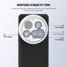- 【Montures d'objectif filetées 17mm intégrées】 Les montures d'objectif filetées 17mm intégrées pour appareil photo principal et téléobjectif permettent de connecter des objectifs de téléphone 17mm, notamment des objectifs macro 105mm, macro 10x, fisheye 8mm, microscope 45x avec éclairage LED, téléobjectif 7x, téléobjectif 60mm, grand angle 18mm et anamorphique bleu 1,55x, pour des prises de vue créatives (objectifs vendus séparément).