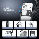 - Installation en 1 clic & Accès complet- S’ouvre et se verrouille via le bouton latéral, sans assemblage requis, tout en conservant un accès total à la caméra, aux ports et aux boutons. Un caoutchouc amovible assure l’utilisation fluide du contrôle caméra, et le design ajouré est entièrement compatible avec la recharge sans fil MagSafe et les accessoires magnétiques.