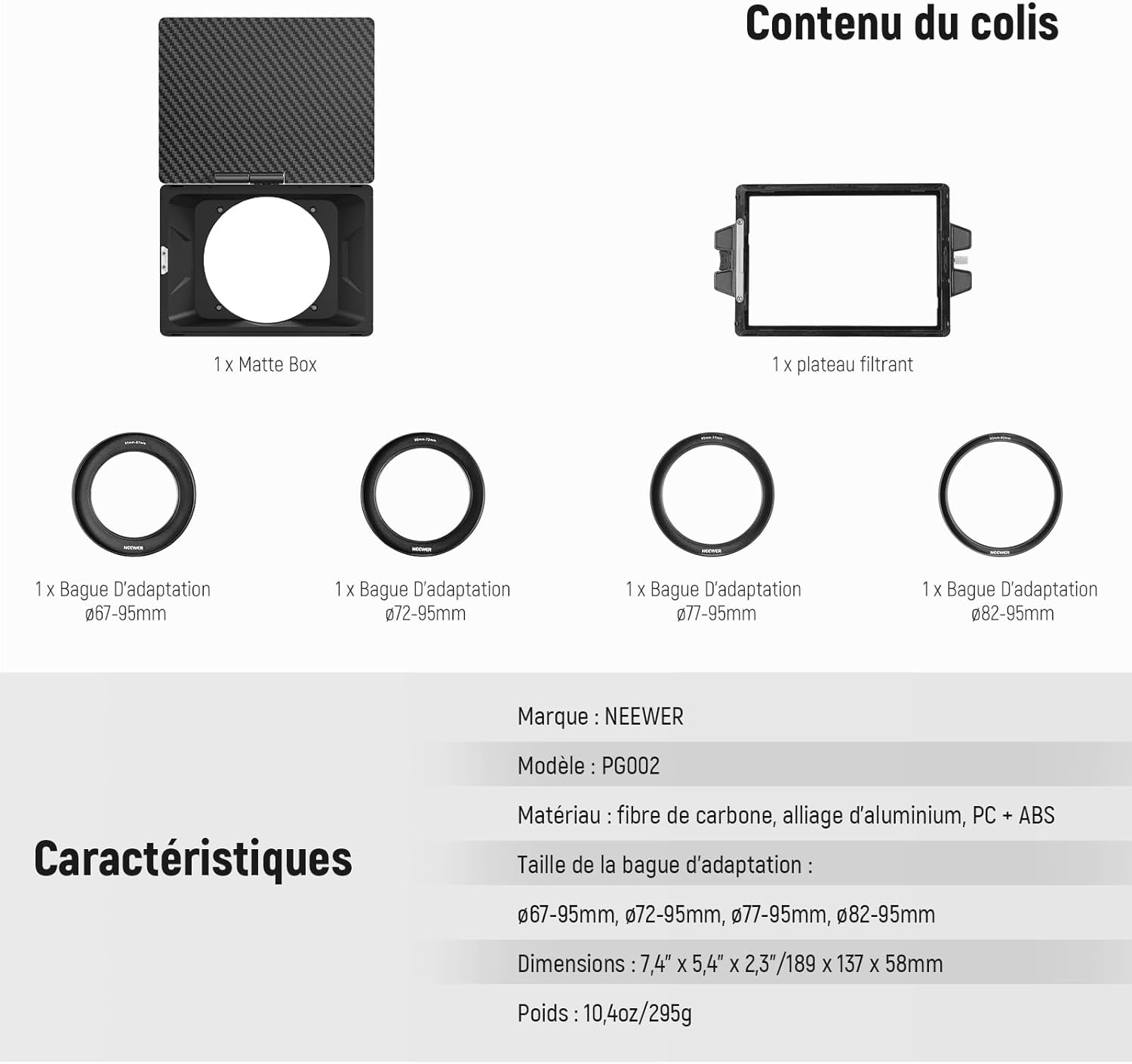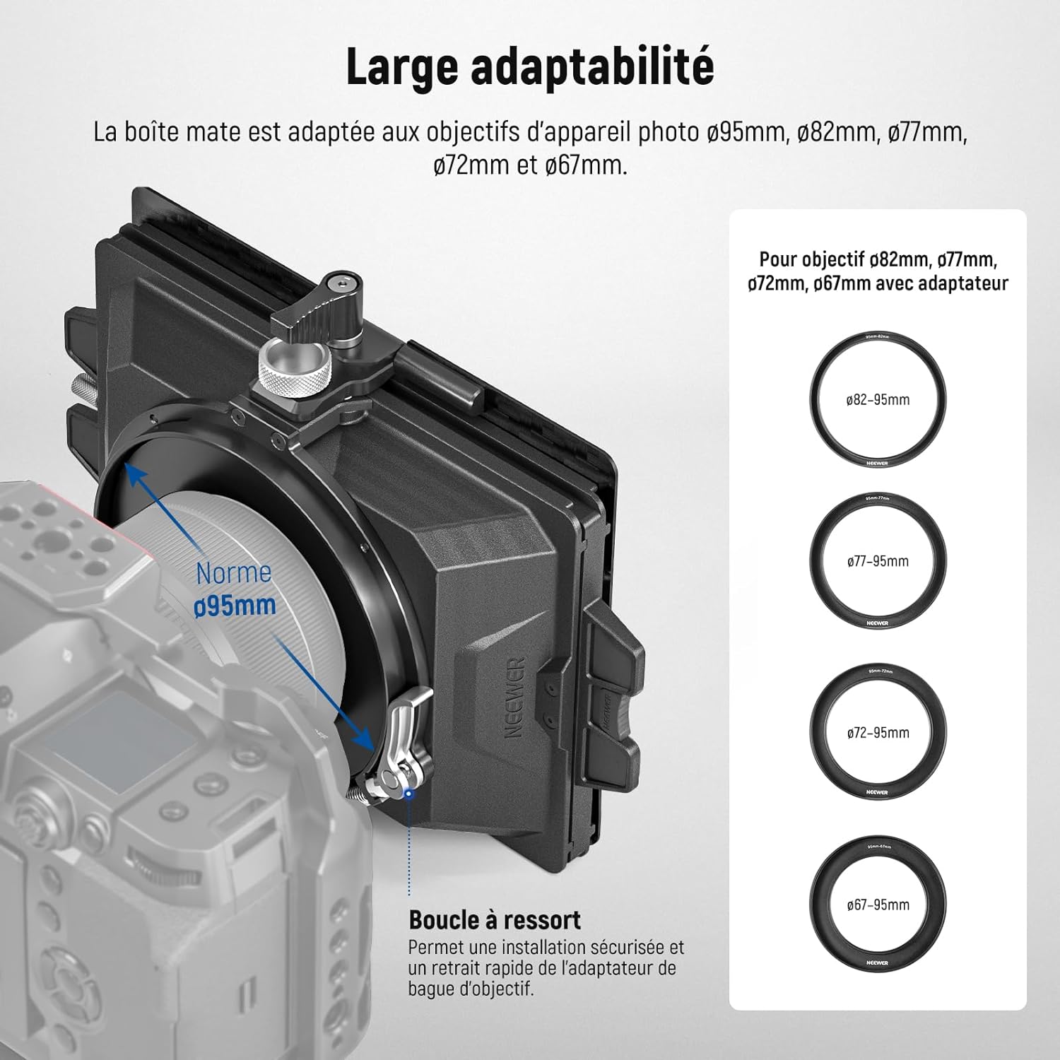 - 【Boîte mate modulaire polyvalente】 La boîte mate NEEWER PG002 est parfaite pour les appareils photo compacts sans miroir et les appareils photo reflex numériques, compatible avec Sony A7R IV A7R V A7S III Canon R6 II R6 R5. Il peut éviter l'éblouissement et les reflets de l'objectif et améliorer le contrôle de l'exposition en bloquant l'excès de lumière du soleil et d'autres sources de lumière.