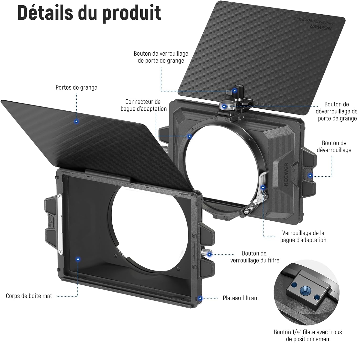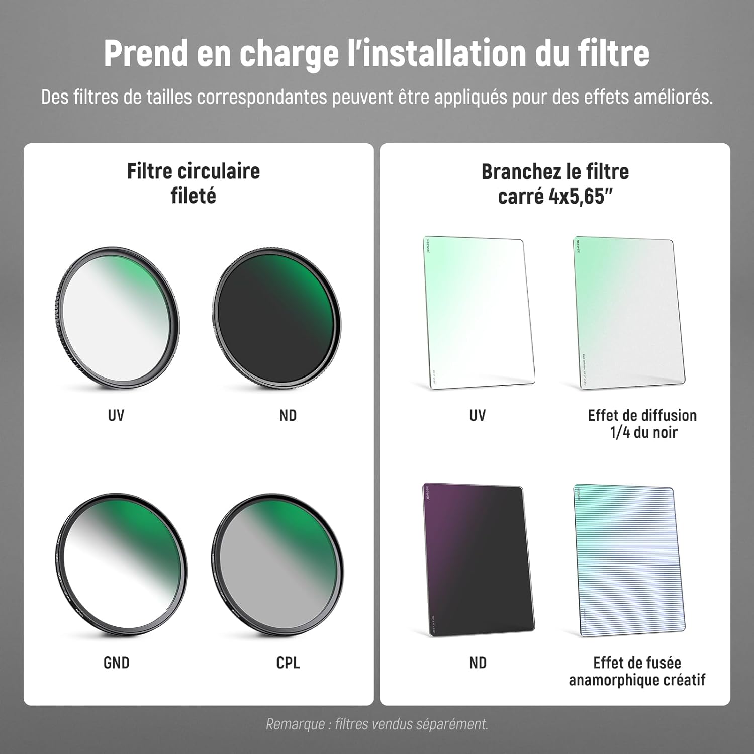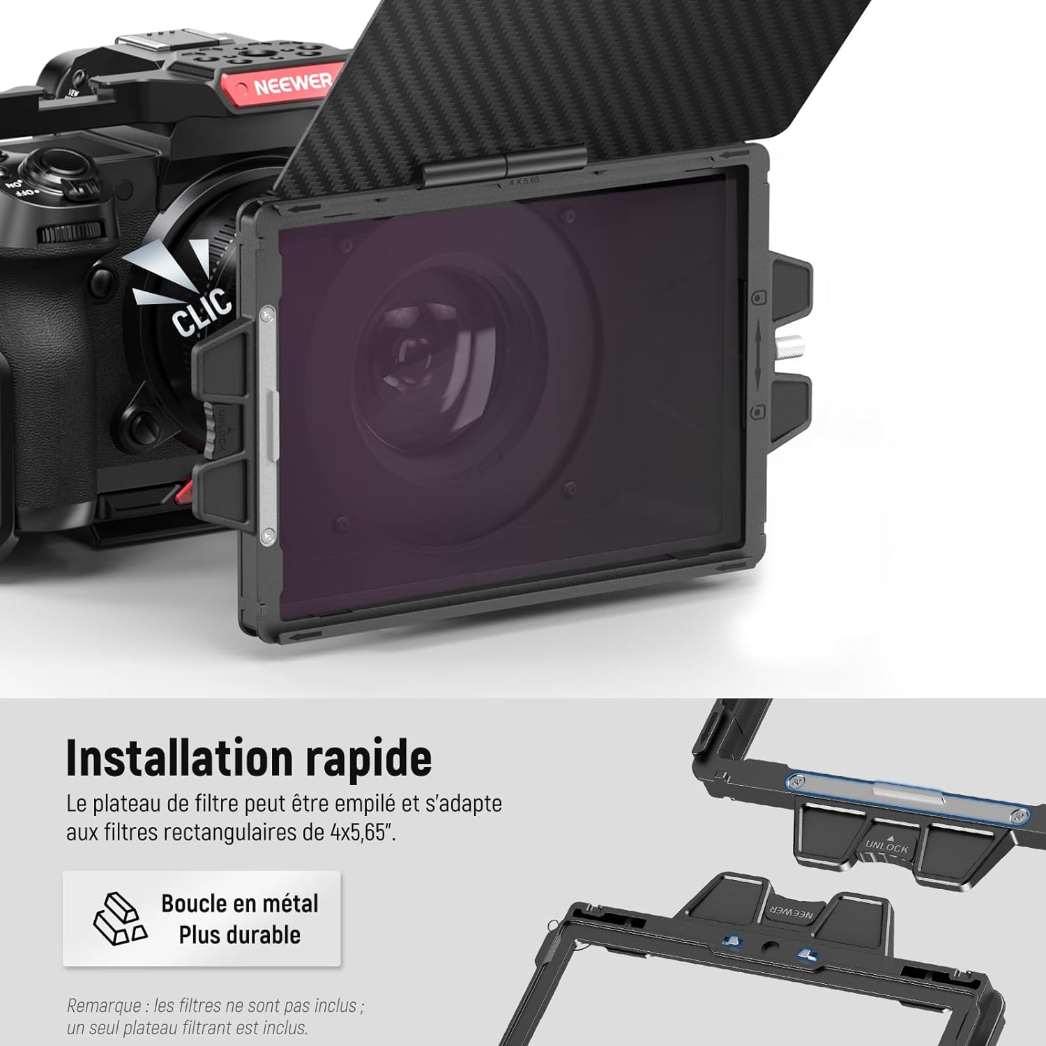 - 【Plateau de filtre standard de 4" x 5,65" 】 Le plateau de filtre inclus convient aux filtres rectangulaires de 4" x 5,65" (non inclus). Les filtres (vendus séparément) peuvent être fixés par les boutons à vis du plateau de filtre et protégés par des coussinets en caoutchouc. Compatible avec K&F Compatible avec NISI Compatible avec TIFFEN Compatible avec Tilta Compatible avec SmallRig filtres carrés pour le tournage